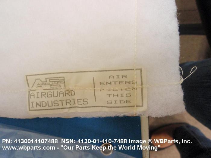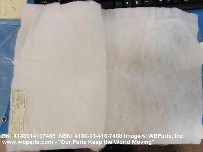 4130-01-410-7488 A replaceable device designed to remove dust, pollen or other foreign matter from the air passing through it. The removal of particles is accomplished by porous, fibrous or shredded material (metallic or non-metallic) which is loosely woven or matted, the shape of which may be maintained by stiffening or binding material. It is designed to fit into a FILTER ELEMENT, AIR CONDITIONING or for direct application to air conditioners, ventilation systems, hot air furnaces, and electrical and electronic equipment which have retaining devices. It may be furnished in custom size form or in a continuous length. Excludes FILTERING PAD, AIR COOLER; and FILTERING ROLL, AIR CONDITIONING. Excludes bulk materials not specifically designed for filtering. See also INSULATION BLANKET, THERMAL; PLASTIC MATERIAL, CELLULAR; RUBBER SHEET, CELLULAR.