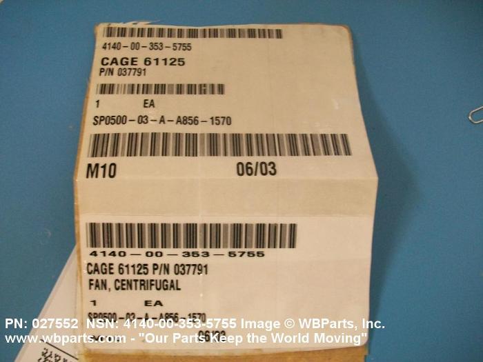 4140-00-541-3436 A nonpositive displacement mechanical device having a centrifugal fan impeller inclosed within a housing. It is designed to move air or gas over a wide range of volumes and pressures. The air or gas is drawn in axially and discharged radially or drawn in radially and discharged axially by centrifugal force through an outlet in the housing.20216600062Aircraft Air Conditioning, Heating, and Pressurizing Equipment41400043Fans, Air Circulators, and Blower Equipment
