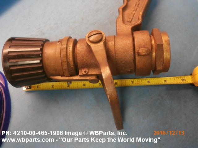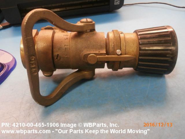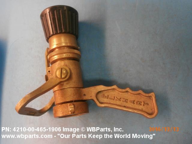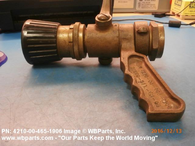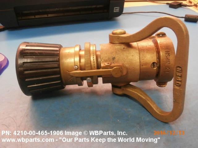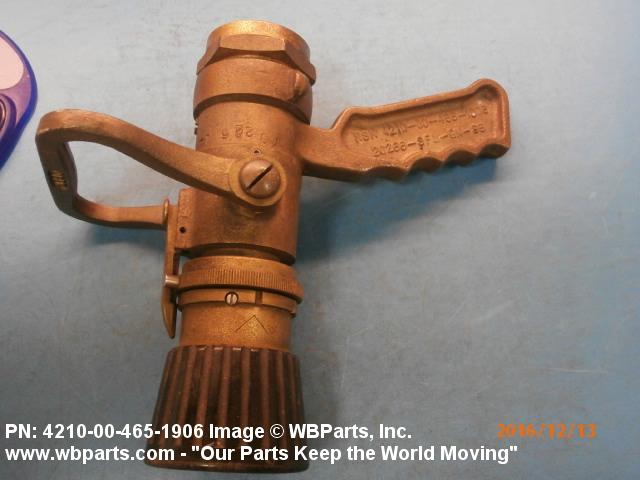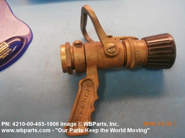 4210-00-465-1906 A device designed for use on fire hose(s), deck pipes, fire trucks and other fire fighting equipment. Maybe mounted on a horizontal or vertical plane to direct a stream or spray of chemical powder, foam, water or vaporizing liquid. Item may contain an automatic discharge flow adjustment, removable tip(s), a PLAY PIPE,NOZZLE,FIRE HOSE and/or a shutoff device. Excludes NOZZLE,MONITOR TYPE,FIRE FIGHTING.10142100323 00