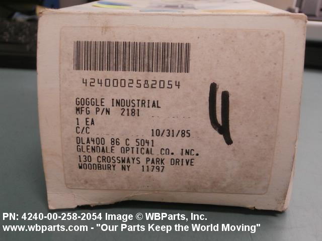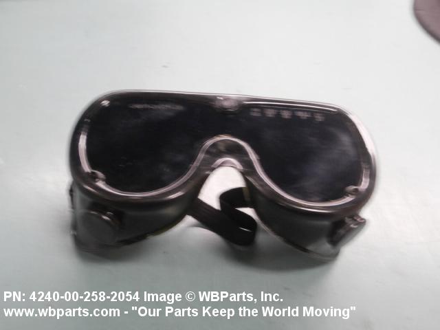 4240-00-258-2054 Goggles designed for eye protection against industrial hazards, such as impact, dust, splash, fumes, gases, or injurious rays. Excludes GOGGLES, FLYERS'; GOGGLES, SUN and goggles having corrective lenses.