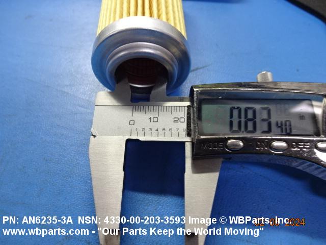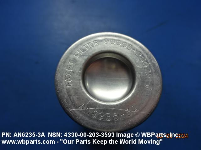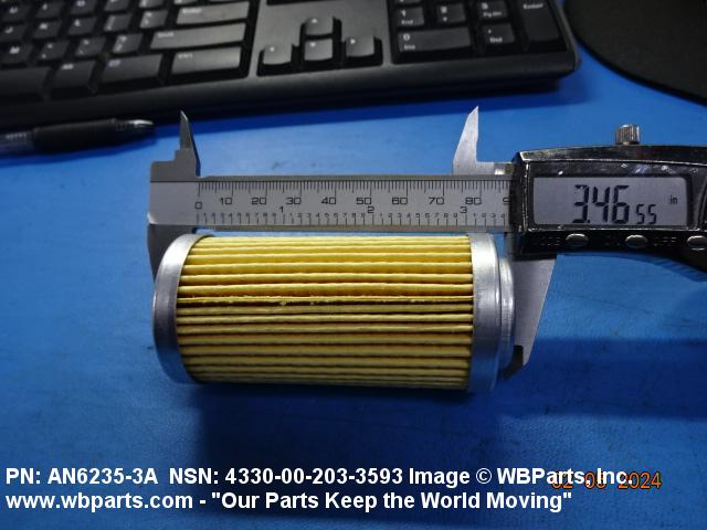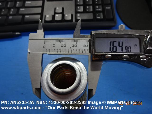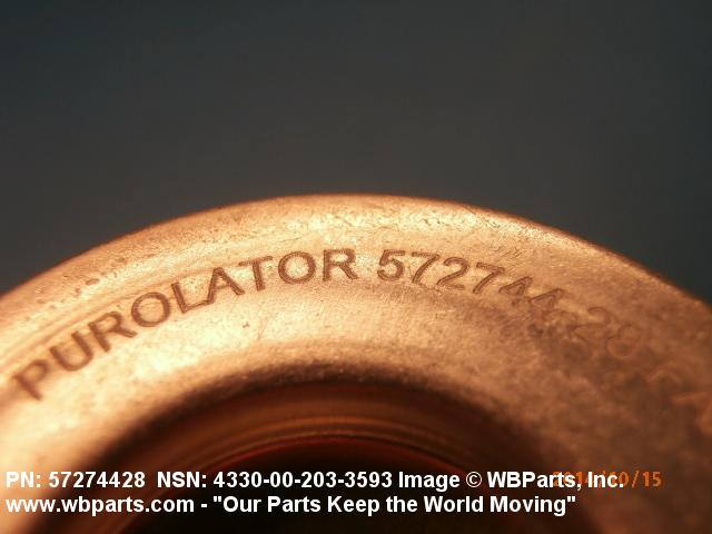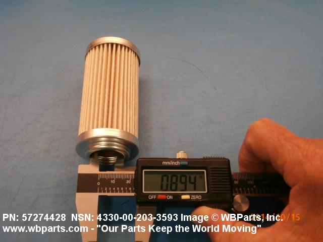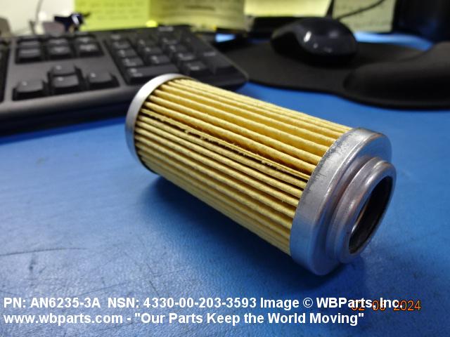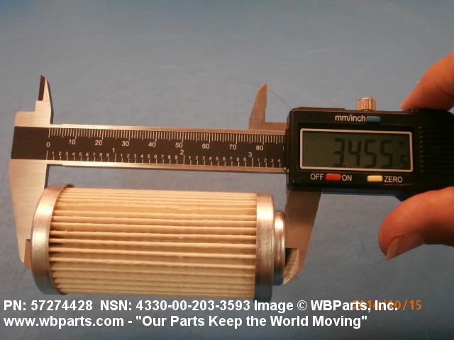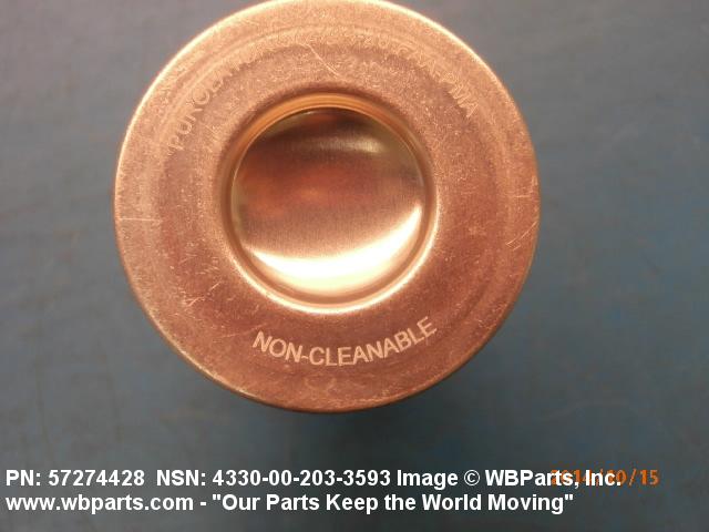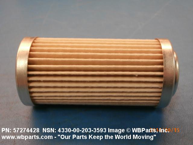 4330-00-203-3593 A replaceable device designed to remove solid particles from fluids ranging in density from heavy liquids to gases. The removal of particles is accomplished by porous material (metallic or non-metallic), stacked disks, wound wire, or the like, constructed so the fluid can flow through the device while the solid particles are retained. It may be designed to fit into a FILTER, FLUID (or similar cavity), or it may have an integral outer casing and mounting facilities and be designed to connect directly to an engine, compressor, or the like. The degree of removal of particles must be nominally rated at less than 50 microns or absolutely rated at less than 75 microns. Excludes FILTER ELEMENT, AIR CONDITIONING. See also STRAINER ELEMENT, SEDIMENT.20916500058Aircraft Hydraulic, Vacuum, and De-icing System Components29100042Engine Fuel System Components, Nonaircraft29150064Engine Fuel System Components, Aircraft and Missile Prime Movers29400064Engine Air and Oil Filters, Strainers, and Cleaners, Nonaircraft29450059Engine Air and Oil Filters, Cleaners, Aircraft Prime Moving43300057Centrifugals, Separators, and Pressure and Vacuum Filters5999000065300053Hospital Furniture, Equipment, Utensils, and Supplies66300029Chemical Analysis Instruments