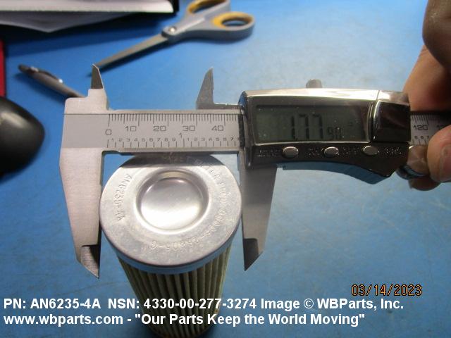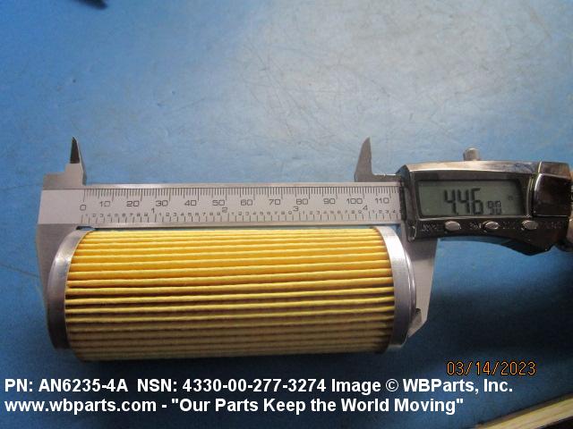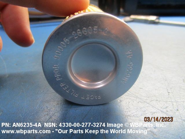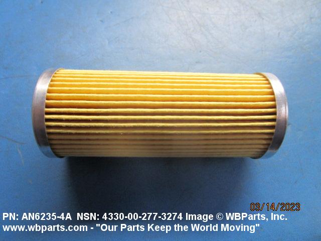 4330-00-277-3274 A replaceable device designed to remove solid particles from fluids ranging in density from heavy liquids to gases. The removal of particles is accomplished by porous material (metallic or non-metallic), stacked disks, wound wire, or the like, constructed so the fluid can flow through the device while the solid particles are retained. It may be designed to fit into a FILTER, FLUID (or similar cavity), or it may have an integral outer casing and mounting facilities and be designed to connect directly to an engine, compressor, or the like. The degree of removal of particles must be nominally rated at less than 50 microns or absolutely rated at less than 75 microns. Excludes FILTER ELEMENT, AIR CONDITIONING. See also STRAINER ELEMENT, SEDIMENT.20916500058Aircraft Hydraulic, Vacuum, and De-icing System Components29100042Engine Fuel System Components, Nonaircraft29150064Engine Fuel System Components, Aircraft and Missile Prime Movers29400064Engine Air and Oil Filters, Strainers, and Cleaners, Nonaircraft29450059Engine Air and Oil Filters, Cleaners, Aircraft Prime Moving43300057Centrifugals, Separators, and Pressure and Vacuum Filters5999000065300053Hospital Furniture, Equipment, Utensils, and Supplies66300029Chemical Analysis Instruments
