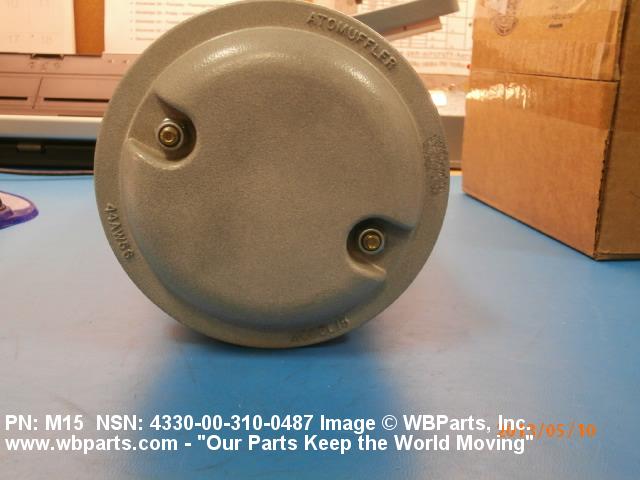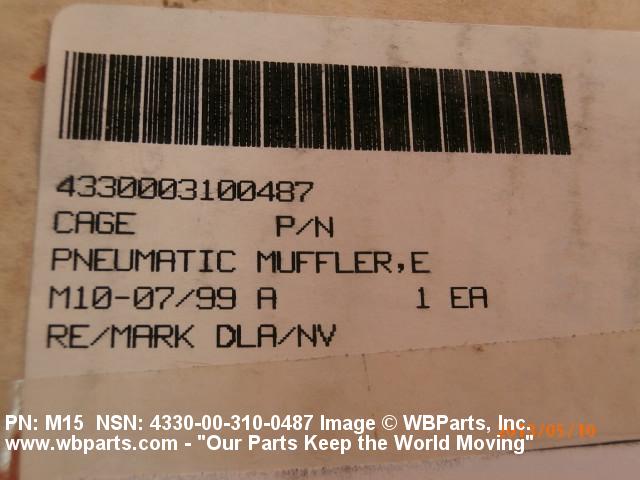 4330-00-310-0487 A noise control/filtering device of various sizes, shapes, designs, materials (metallic/non-metallic) and varied mounting configurations used to diffuse air blasts, lowers air velocity, reduce noise, filtration of airborne moisture and/or dust contamination, pressure equalization, speed control for air operated devices. For vehicular application see MUFFLER, (as modified).20343100028Compressors and Vacuum Pumps43300057Centrifugals, Separators, and Pressure and Vacuum Filters47300051Hose, Pipe, Tube, Lubrication, and Railing Fittings