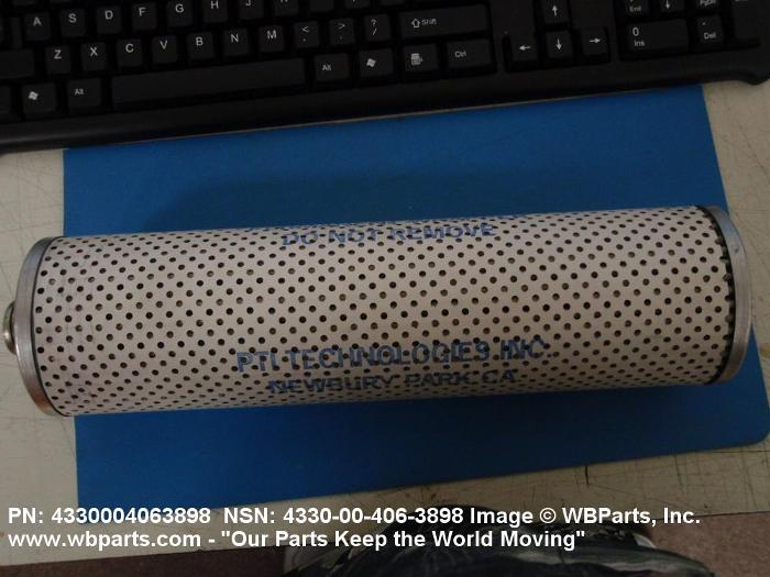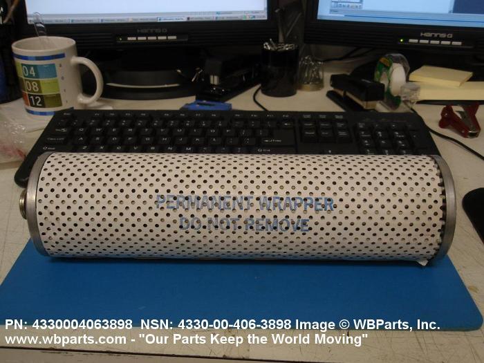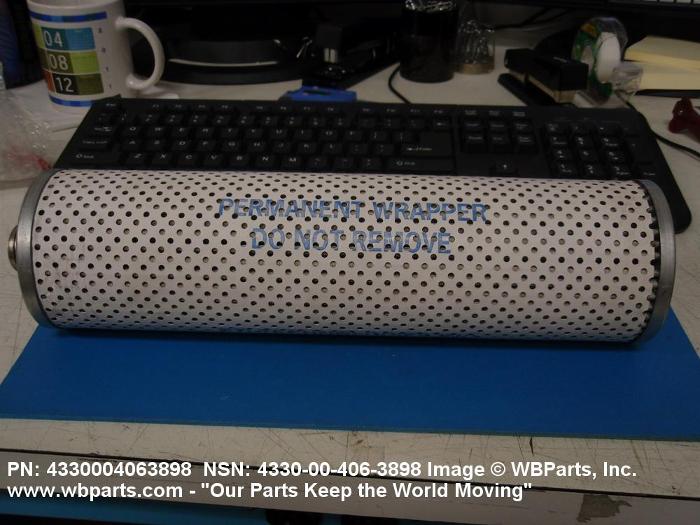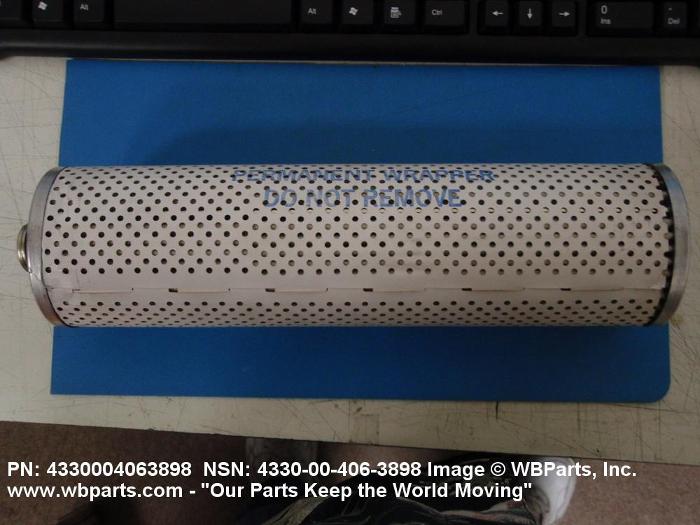 4330-00-406-3898 A replaceable device designed to remove solid particles from fluids ranging in density from heavy liquids to gases. The removal of particles is accomplished by porous material (metallic or non-metallic), stacked disks, wound wire, or the like, constructed so the fluid can flow through the device while the solid particles are retained. It may be designed to fit into a FILTER, FLUID (or similar cavity), or it may have an integral outer casing and mounting facilities and be designed to connect directly to an engine, compressor, or the like. The degree of removal of particles must be nominally rated at less than 50 microns or absolutely rated at less than 75 microns. Excludes FILTER ELEMENT, AIR CONDITIONING. See also STRAINER ELEMENT, SEDIMENT.20916500058Aircraft Hydraulic, Vacuum, and De-icing System Components29100042Engine Fuel System Components, Nonaircraft29150064Engine Fuel System Components, Aircraft and Missile Prime Movers29400064Engine Air and Oil Filters, Strainers, and Cleaners, Nonaircraft29450059Engine Air and Oil Filters, Cleaners, Aircraft Prime Moving43300057Centrifugals, Separators, and Pressure and Vacuum Filters5999000065300053Hospital Furniture, Equipment, Utensils, and Supplies66300029Chemical Analysis Instruments