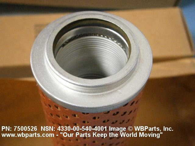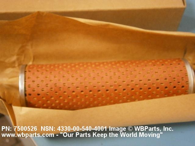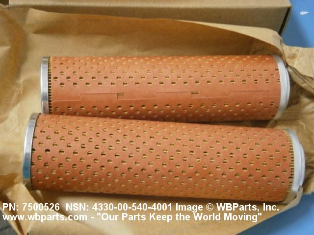4330-00-540-4001 A replaceable device designed to remove solid particles from fluids ranging in density from heavy liquids to gases. The removal of particles is accomplished by porous material (metallic or non-metallic), stacked disks, wound wire, or the like, constructed so the fluid can flow through the device while the solid particles are retained. It may be designed to fit into a FILTER, FLUID (or similar cavity), or it may have an integral outer casing and mounting facilities and be designed to connect directly to an engine, compressor, or the like. The degree of removal of particles must be nominally rated at less than 50 microns or absolutely rated at less than 75 microns. Excludes FILTER ELEMENT, AIR CONDITIONING. See also STRAINER ELEMENT, SEDIMENT.20916500058Aircraft Hydraulic, Vacuum, and De-icing System Components29100042Engine Fuel System Components, Nonaircraft29150064Engine Fuel System Components, Aircraft and Missile Prime Movers29400064Engine Air and Oil Filters, Strainers, and Cleaners, Nonaircraft29450059Engine Air and Oil Filters, Cleaners, Aircraft Prime Moving43300057Centrifugals, Separators, and Pressure and Vacuum Filters5999000065300053Hospital Furniture, Equipment, Utensils, and Supplies66300029Chemical Analysis Instruments