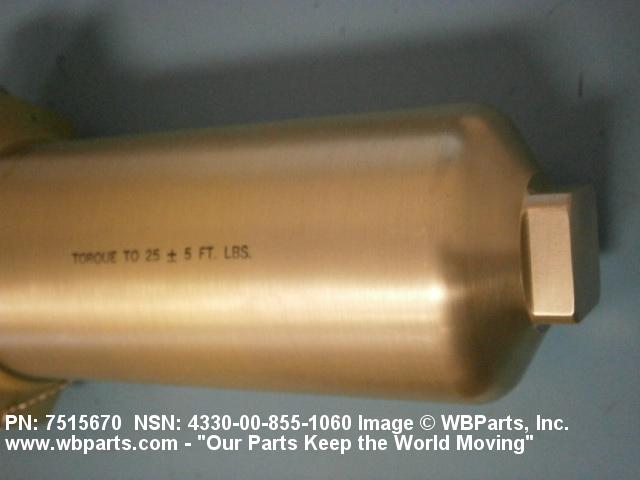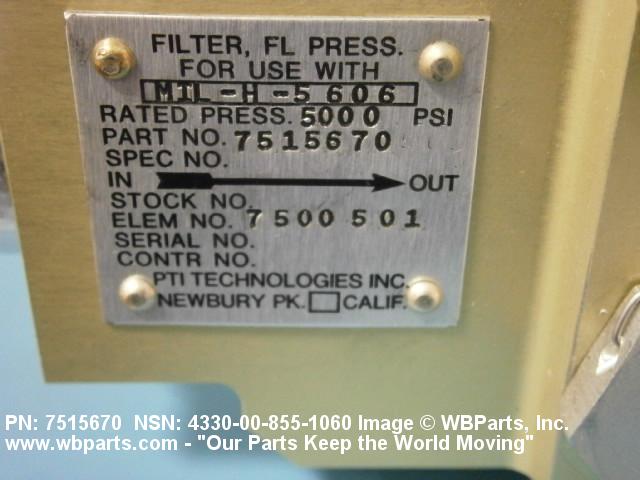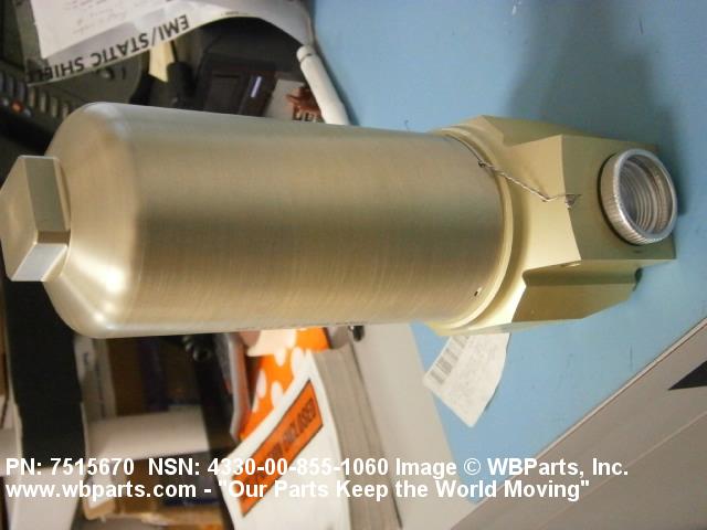 4330-00-855-1060 A filter having inlet and outlet connections and designed to be connected in a pipe, tube or hose line. For spin-on, base-mounted filtering devices with integral outer casings, see FILTER ELEMENT, FLUID. Excludes AIR CONDITIONER.21516500058Aircraft Hydraulic, Vacuum, and De-icing System Components16600062Aircraft Air Conditioning, Heating, and Pressurizing Equipment25300060Vehicular Brake, Steering, Axle, Wheel, and Track Components29100042Engine Fuel System Components, Nonaircraft29150064Engine Fuel System Components, Aircraft and Missile Prime Movers29400064Engine Air and Oil Filters, Strainers, and Cleaners, Nonaircraft29450059Engine Air and Oil Filters, Cleaners, Aircraft Prime Moving41300045Refrigeration and Air Conditioning Components43300057Centrifugals, Separators, and Pressure and Vacuum Filters4930000063500059Miscellaneous Alarm, Signal, and Security Detection Systems65150057Medical and Surgical Instruments, Equipment, and Supplies65300053Hospital Furniture, Equipment, Utensils, and Supplies65400047Ophthalmic Instruments, Equipment, and Supplies66300029Chemical Analysis Instruments