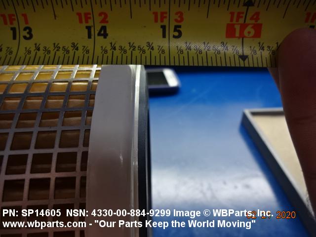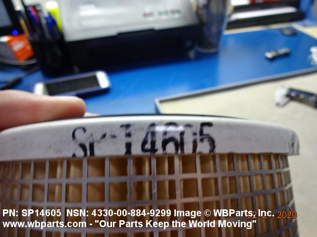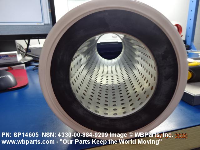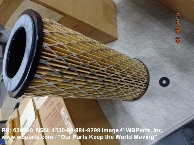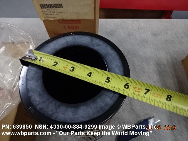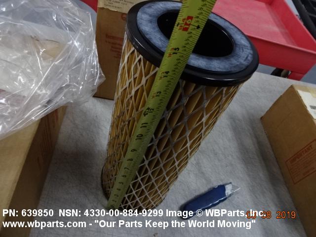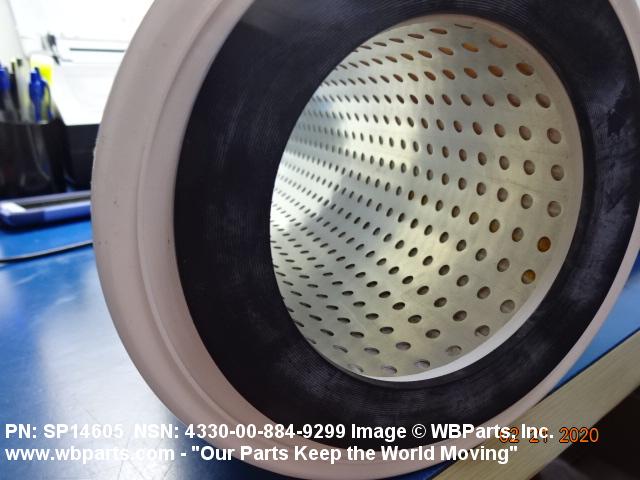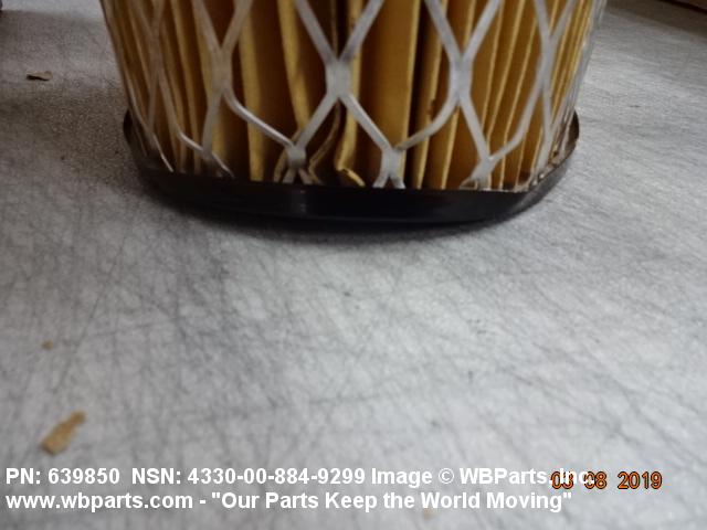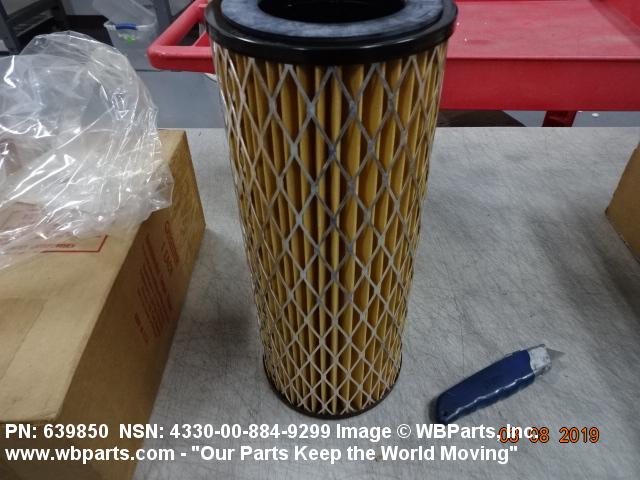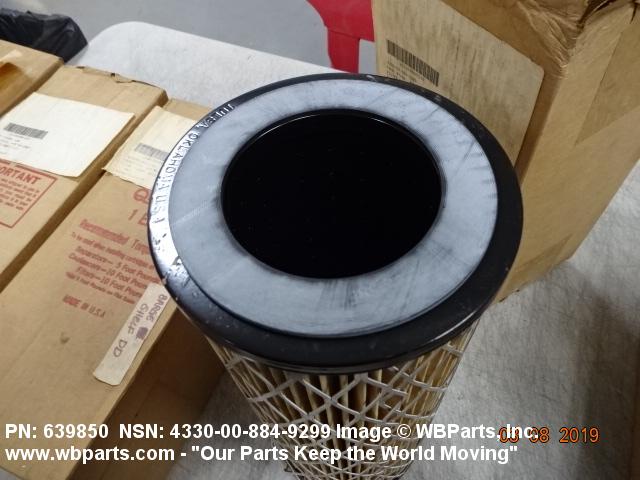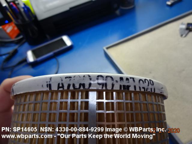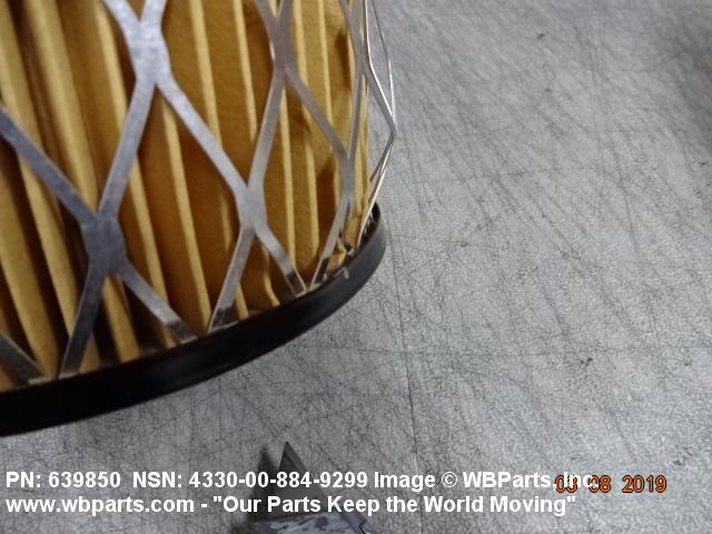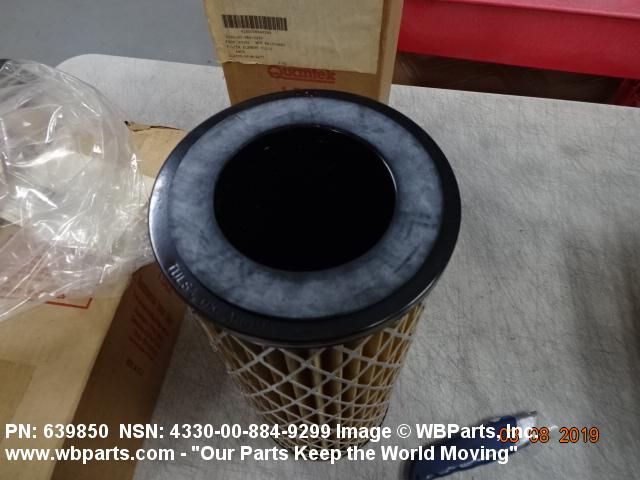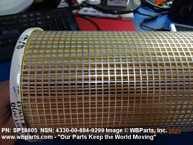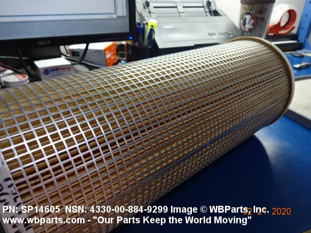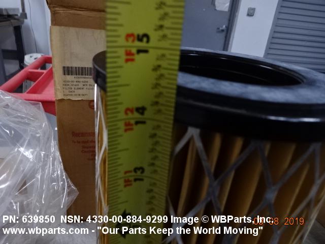4330-00-884-9299 A replaceable device designed to remove solid particles from fluids ranging in density from heavy liquids to gases. The removal of particles is accomplished by porous material (metallic or non-metallic), stacked disks, wound wire, or the like, constructed so the fluid can flow through the device while the solid particles are retained. It may be designed to fit into a FILTER, FLUID (or similar cavity), or it may have an integral outer casing and mounting facilities and be designed to connect directly to an engine, compressor, or the like. The degree of removal of particles must be nominally rated at less than 50 microns or absolutely rated at less than 75 microns. Excludes FILTER ELEMENT, AIR CONDITIONING. See also STRAINER ELEMENT, SEDIMENT.20916500058Aircraft Hydraulic, Vacuum, and De-icing System Components29100042Engine Fuel System Components, Nonaircraft29150064Engine Fuel System Components, Aircraft and Missile Prime Movers29400064Engine Air and Oil Filters, Strainers, and Cleaners, Nonaircraft29450059Engine Air and Oil Filters, Cleaners, Aircraft Prime Moving43300057Centrifugals, Separators, and Pressure and Vacuum Filters5999000065300053Hospital Furniture, Equipment, Utensils, and Supplies66300029Chemical Analysis Instruments