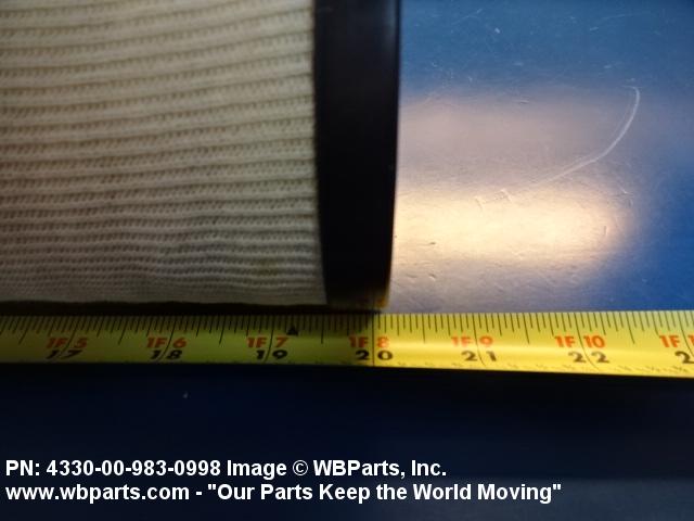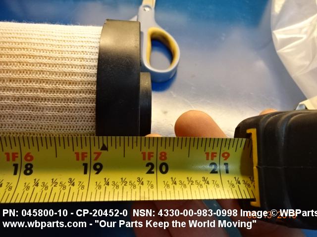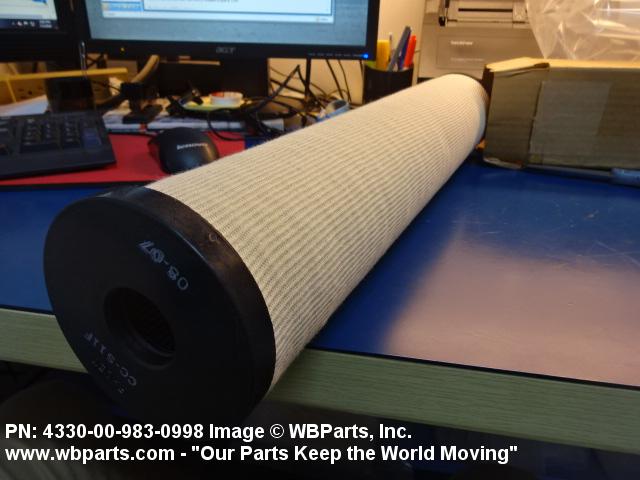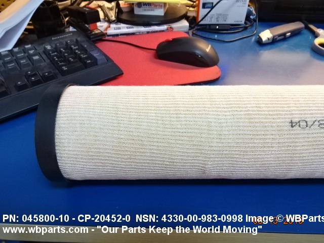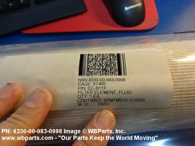 4330-00-983-0998 A replaceable device designed to remove solid particles from fluids ranging in density from heavy liquids to gases. The removal of particles is accomplished by porous material (metallic or non-metallic), stacked disks, wound wire, or the like, constructed so the fluid can flow through the device while the solid particles are retained. It may be designed to fit into a FILTER, FLUID (or similar cavity), or it may have an integral outer casing and mounting facilities and be designed to connect directly to an engine, compressor, or the like. The degree of removal of particles must be nominally rated at less than 50 microns or absolutely rated at less than 75 microns. Excludes FILTER ELEMENT, AIR CONDITIONING. See also STRAINER ELEMENT, SEDIMENT.20916500058Aircraft Hydraulic, Vacuum, and De-icing System Components29100042Engine Fuel System Components, Nonaircraft29150064Engine Fuel System Components, Aircraft and Missile Prime Movers29400064Engine Air and Oil Filters, Strainers, and Cleaners, Nonaircraft29450059Engine Air and Oil Filters, Cleaners, Aircraft Prime Moving43300057Centrifugals, Separators, and Pressure and Vacuum Filters5999000065300053Hospital Furniture, Equipment, Utensils, and Supplies66300029Chemical Analysis Instruments