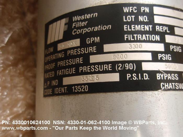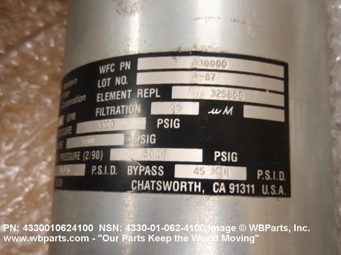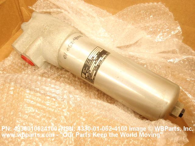 4330-01-062-4100 A filter having inlet and outlet connections and designed to be connected in a pipe, tube or hose line. For spin-on, base-mounted filtering devices with integral outer casings, see FILTER ELEMENT, FLUID. Excludes AIR CONDITIONER.21516500058Aircraft Hydraulic, Vacuum, and De-icing System Components16600062Aircraft Air Conditioning, Heating, and Pressurizing Equipment25300060Vehicular Brake, Steering, Axle, Wheel, and Track Components29100042Engine Fuel System Components, Nonaircraft29150064Engine Fuel System Components, Aircraft and Missile Prime Movers29400064Engine Air and Oil Filters, Strainers, and Cleaners, Nonaircraft29450059Engine Air and Oil Filters, Cleaners, Aircraft Prime Moving41300045Refrigeration and Air Conditioning Components43300057Centrifugals, Separators, and Pressure and Vacuum Filters4930000063500059Miscellaneous Alarm, Signal, and Security Detection Systems65150057Medical and Surgical Instruments, Equipment, and Supplies65300053Hospital Furniture, Equipment, Utensils, and Supplies65400047Ophthalmic Instruments, Equipment, and Supplies66300029Chemical Analysis Instruments
