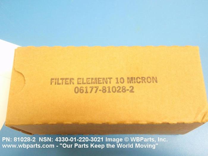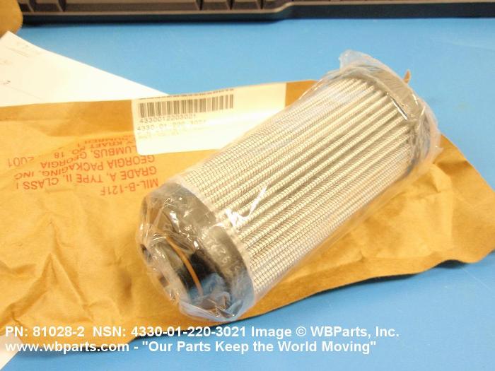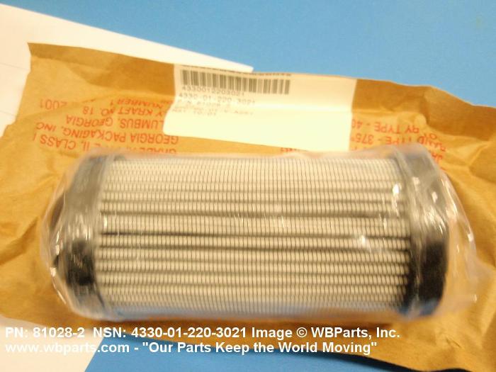 4330-01-220-3021 A replaceable device designed to remove solid particles from fluids ranging in density from heavy liquids to gases. The removal of particles is accomplished by porous material (metallic or non-metallic), stacked disks, wound wire, or the like, constructed so the fluid can flow through the device while the solid particles are retained. It may be designed to fit into a FILTER, FLUID (or similar cavity), or it may have an integral outer casing and mounting facilities and be designed to connect directly to an engine, compressor, or the like. The degree of removal of particles must be nominally rated at less than 50 microns or absolutely rated at less than 75 microns. Excludes FILTER ELEMENT, AIR CONDITIONING. See also STRAINER ELEMENT, SEDIMENT.20916500058Aircraft Hydraulic, Vacuum, and De-icing System Components29100042Engine Fuel System Components, Nonaircraft29150064Engine Fuel System Components, Aircraft and Missile Prime Movers29400064Engine Air and Oil Filters, Strainers, and Cleaners, Nonaircraft29450059Engine Air and Oil Filters, Cleaners, Aircraft Prime Moving43300057Centrifugals, Separators, and Pressure and Vacuum Filters5999000065300053Hospital Furniture, Equipment, Utensils, and Supplies66300029Chemical Analysis Instruments
