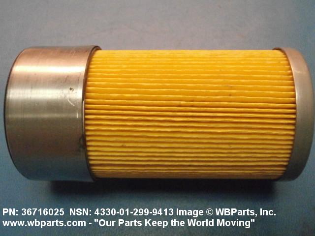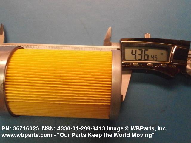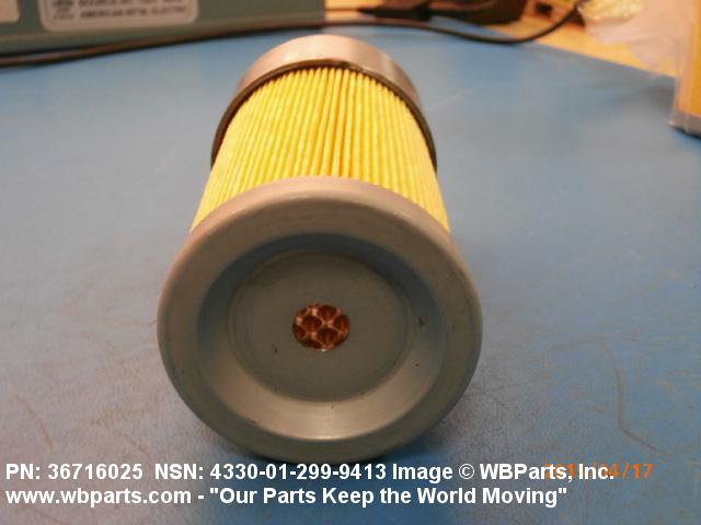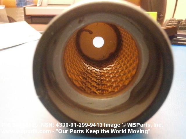 4330-01-299-9413 A replaceable device designed to remove solid particles from fluids ranging in density from heavy liquids to gases. The removal of particles is accomplished by porous material (metallic or non-metallic), stacked disks, wound wire, or the like, constructed so the fluid can flow through the device while the solid particles are retained. It may be designed to fit into a FILTER, FLUID (or similar cavity), or it may have an integral outer casing and mounting facilities and be designed to connect directly to an engine, compressor, or the like. The degree of removal of particles must be nominally rated at less than 50 microns or absolutely rated at less than 75 microns. Excludes FILTER ELEMENT, AIR CONDITIONING. See also STRAINER ELEMENT, SEDIMENT.20916500058Aircraft Hydraulic, Vacuum, and De-icing System Components29100042Engine Fuel System Components, Nonaircraft29150064Engine Fuel System Components, Aircraft and Missile Prime Movers29400064Engine Air and Oil Filters, Strainers, and Cleaners, Nonaircraft29450059Engine Air and Oil Filters, Cleaners, Aircraft Prime Moving43300057Centrifugals, Separators, and Pressure and Vacuum Filters5999000065300053Hospital Furniture, Equipment, Utensils, and Supplies66300029Chemical Analysis Instruments