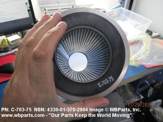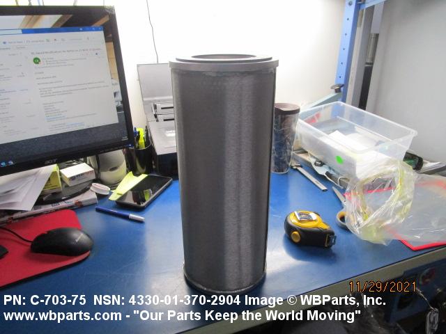 4330-01-370-2904 A replaceable device designed to remove solid particles from fluids ranging in density from heavy liquids to gases. The removal of particles is accomplished by porous material (metallic or non-metallic), stacked disks, wound wire, or the like, constructed so the fluid can flow through the device while the solid particles are retained. It may be designed to fit into a FILTER, FLUID (or similar cavity), or it may have an integral outer casing and mounting facilities and be designed to connect directly to an engine, compressor, or the like. The degree of removal of particles must be nominally rated at less than 50 microns or absolutely rated at less than 75 microns. Excludes FILTER ELEMENT, AIR CONDITIONING. See also STRAINER ELEMENT, SEDIMENT.20916500058Aircraft Hydraulic, Vacuum, and De-icing System Components29100042Engine Fuel System Components, Nonaircraft29150064Engine Fuel System Components, Aircraft and Missile Prime Movers29400064Engine Air and Oil Filters, Strainers, and Cleaners, Nonaircraft29450059Engine Air and Oil Filters, Cleaners, Aircraft Prime Moving43300057Centrifugals, Separators, and Pressure and Vacuum Filters5999000065300053Hospital Furniture, Equipment, Utensils, and Supplies66300029Chemical Analysis Instruments