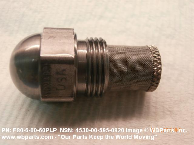 4530-00-595-0920 An essentially tubular fitting which forms the combustion outlet end of the fuel feed line in a pressure oil burner. It has a single, threaded oil inlet connection at one end and a nonconnected outlet at the other through which the oil is released in the boiler combustion chamber in the form of a spray. Outlet tip may be separable. May include strainer, filter, and/or adapter.