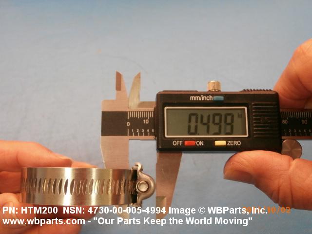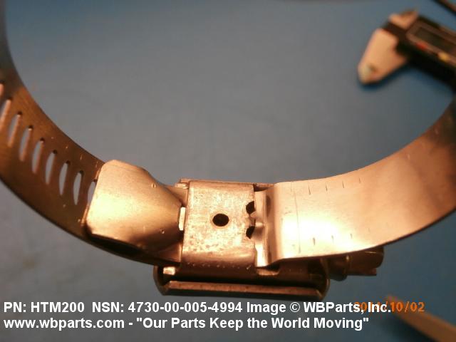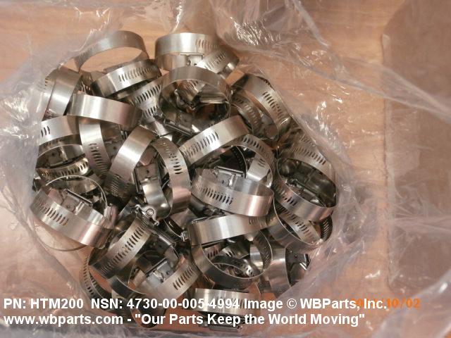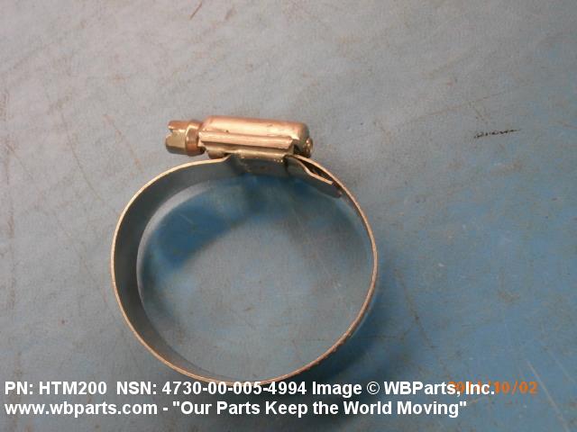 4730-00-005-4994 A clamp in which the body (band or wire) completely encircles an item and distributes a relatively even amount of pressure throughout the entire 360 degrees (6.282 radians) of the periphery of the item to be compressed. Its compression quality is dependent upon an integral screw mechanism, (screw, bolt spring compression and the like mechanical fasteners), or it may be applied by a device not integral with the clamp itself. It is specifically designed to prevent leakage between a hose and its attaching connection(s) when the body of the clamp is round or circular. For square, rectangular, or irregularly shaped items, see CLAMP, HOSE, SPECIAL-SHAPED. Excludes CLAMP, ELECTRICAL; CLAMP, LOOP; CLAMP, FIRE HOSE, SHUTOFF; FERRULE (as modified); and HAND SCREW.