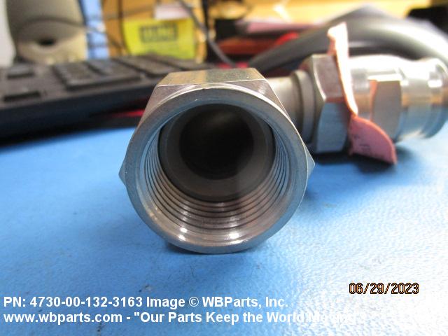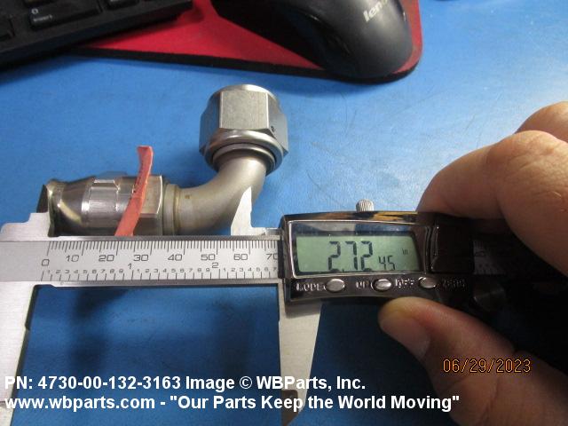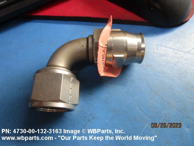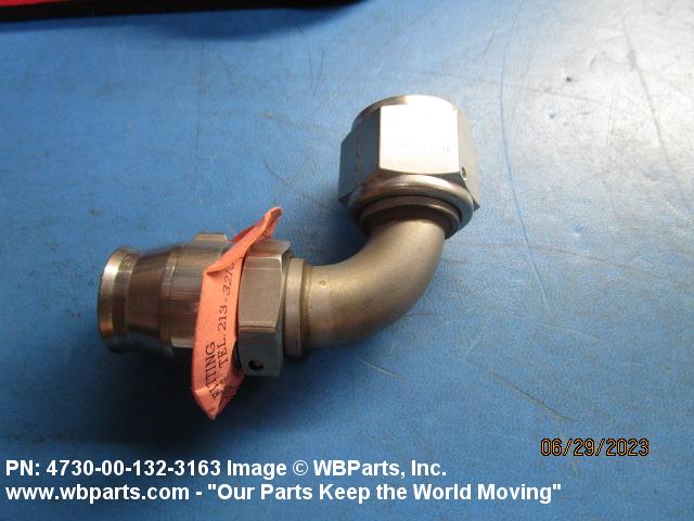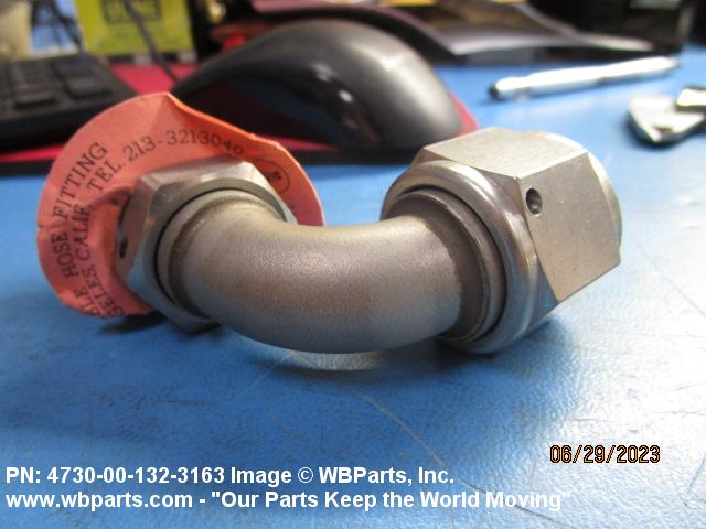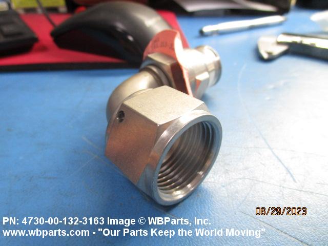 4730-00-132-3163 A fitting that forms an angle of less than 180 degrees (3.141 radians) from a straight flow. One connecting end has machine threads (straight threads other than pipe or hose series) designed to accommodate a tube, or is unthreaded and designed to accommodate a tube, The other end has standard hose threads, an incomplete part of a threaded end connection that grips the hose directly, or is unthreaded and designed to accommodate a hose. It may have side or heel inlet(s). See also ELBOW, HOSE; CONNECTOR, MULTIPLE, FLUID PRESSURE LINE; and ELBOW, SWIVEL FLANGE TO HOSE.
