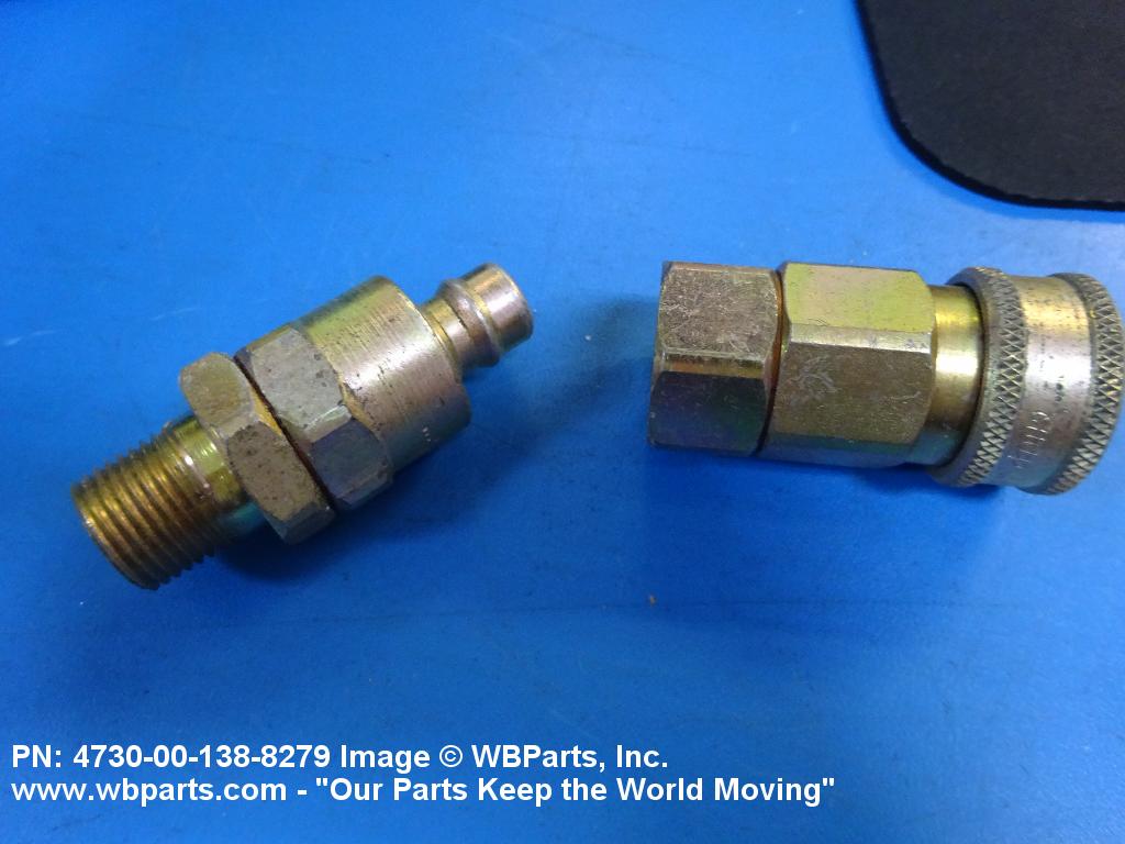 4730-00-138-8279 A multipiece fluid line fitting consisting of two COUPLING HALF, QUICK DISCONNECT fittings.