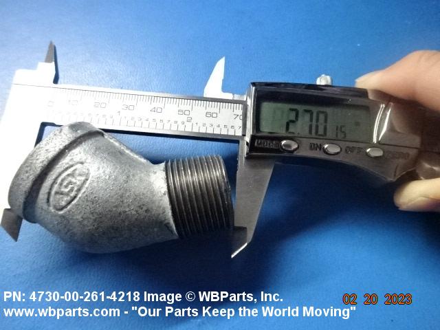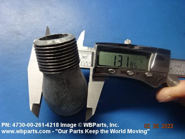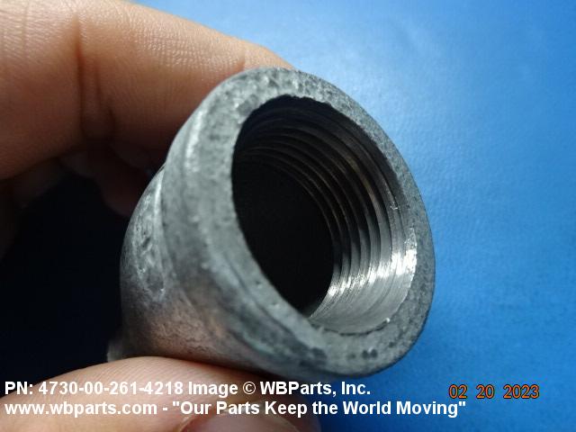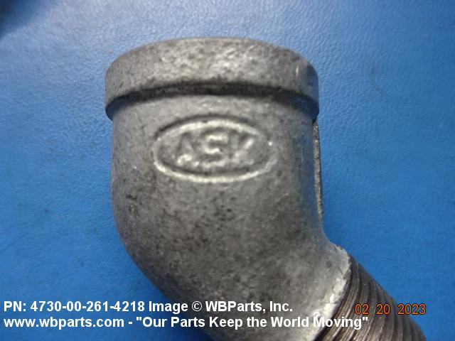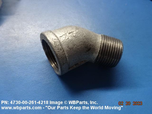 4730-00-261-4218 A fitting that forms an angle of less than 180 degrees (3.141 radians) from the straight flow. Both connecting ends have standard pipe threads or are unthreaded and designed to accommodate a pipe. It may have side or heel inlet(s). See also ELBOW, TUBE; and CONNECTOR, MULTIPLE, FLUID PRESSURE LINE. Excludes BEND, SOIL PIPE.