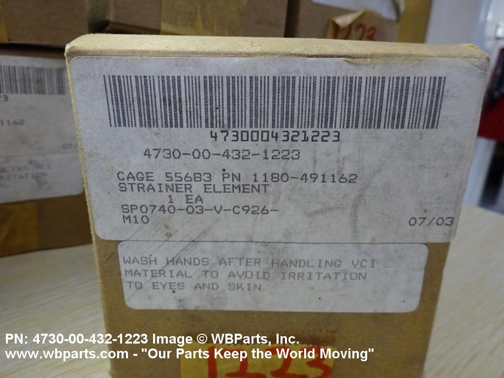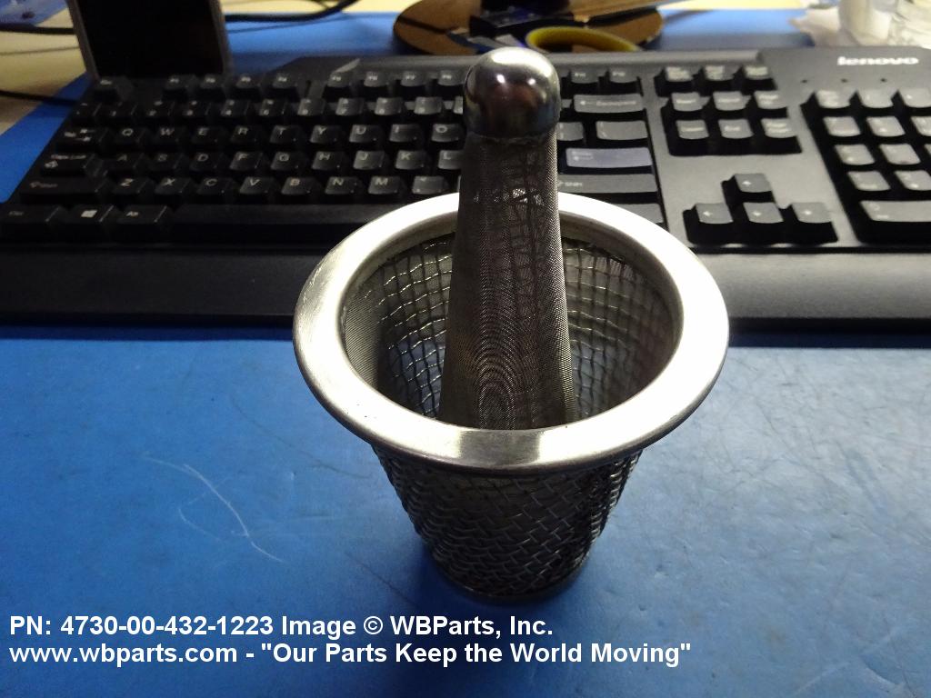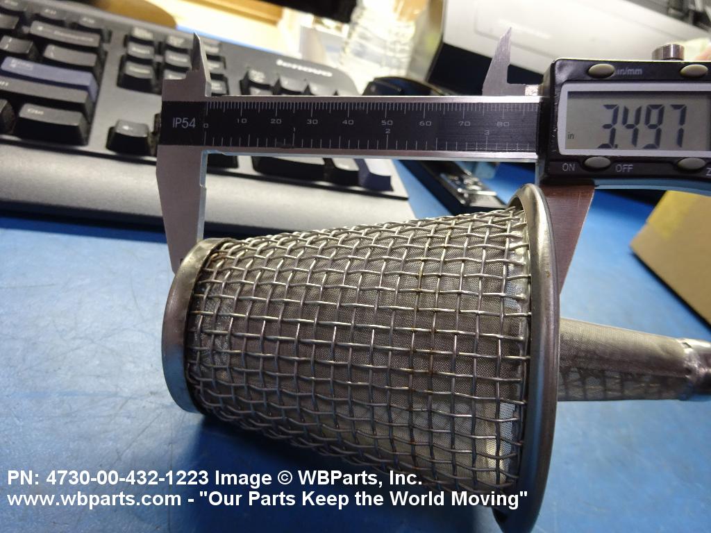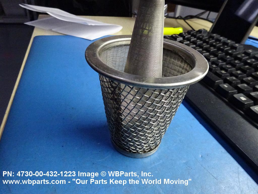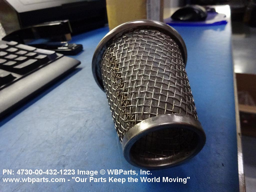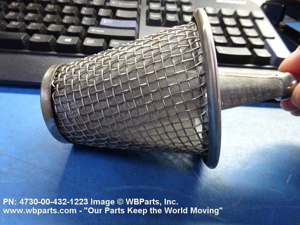 4730-00-432-1223 A replaceable device designed to remove solid particles from flowing liquids. The removal of particles is accomplished by porous material (metallic or non-metallic), wire mesh, perforated metal, or the like, constructed so the liquid can flow through the device while the solid particles are retained. It is designed to fit into a STRAINER, SEDIMENT (or similar cavity). It may have a reinforcement to prevent collapsing, distorting or rupturing. The degree of particles removed must be nominally rated at 50 microns, or more, or absolutely rated at 75 microns, or more. See also FILTER ELEMENT, FLUID.