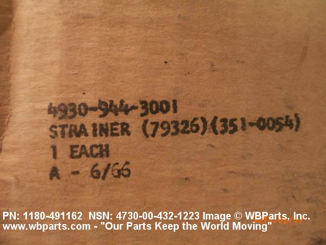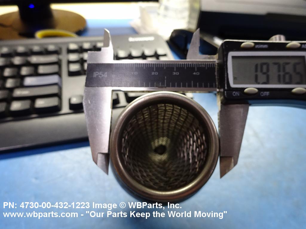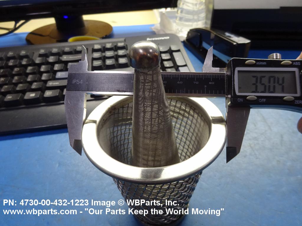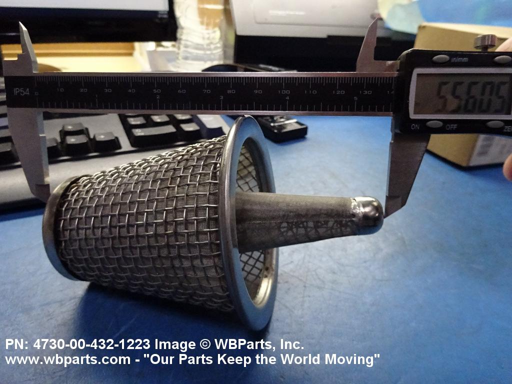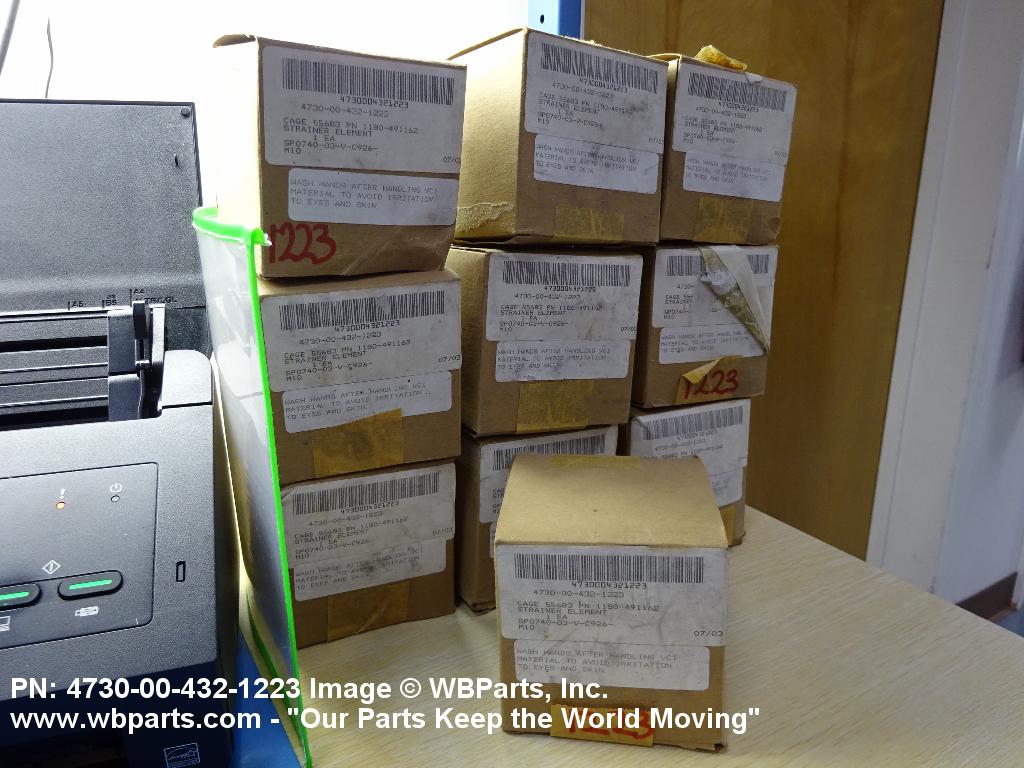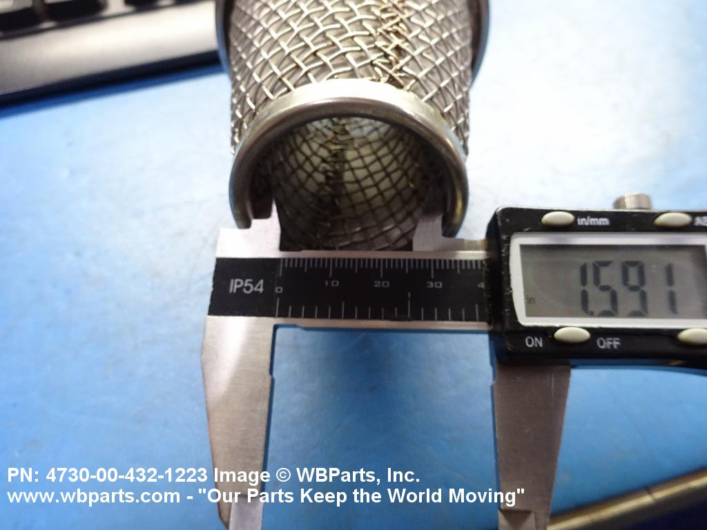 4730-00-432-1223 A replaceable device designed to remove solid particles from flowing liquids. The removal of particles is accomplished by porous material (metallic or non-metallic), wire mesh, perforated metal, or the like, constructed so the liquid can flow through the device while the solid particles are retained. It is designed to fit into a STRAINER, SEDIMENT (or similar cavity). It may have a reinforcement to prevent collapsing, distorting or rupturing. The degree of particles removed must be nominally rated at 50 microns, or more, or absolutely rated at 75 microns, or more. See also FILTER ELEMENT, FLUID.