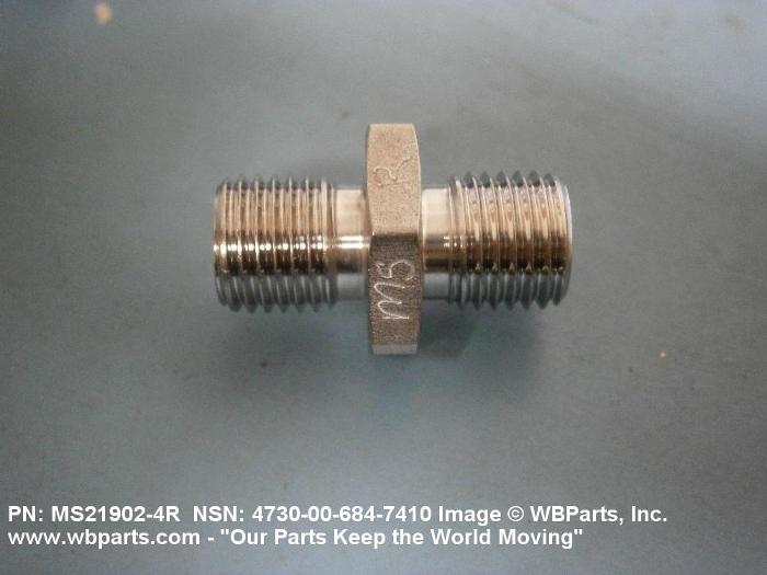 4730-00-684-7410 A straight, one-piece fitting used to join two bosses or boss fittings. Both ends are the same size and have external machine threads (straignt threads other than pipe or hose series). It is designed to facilitate a gasket, preformed packing, washer, or the like to form a seal at the boss. The center section may be suitably shaped to accommodate a wrench.