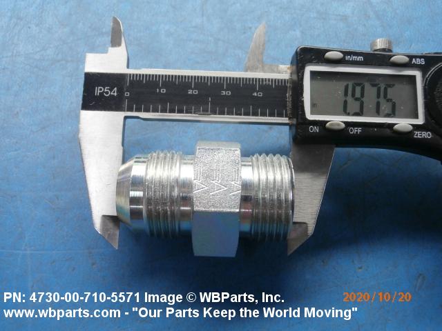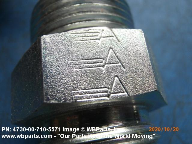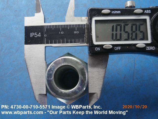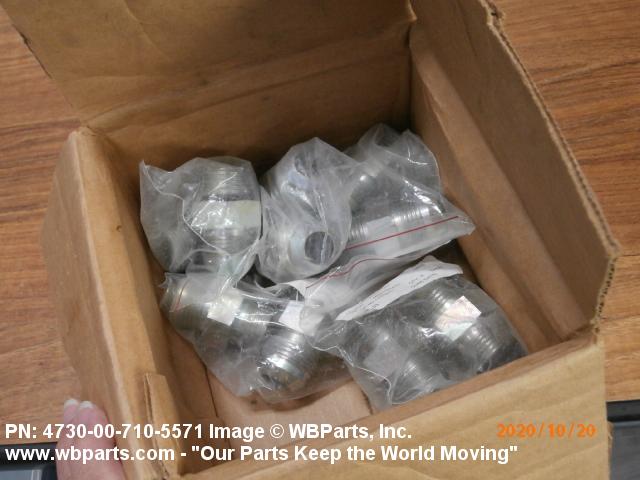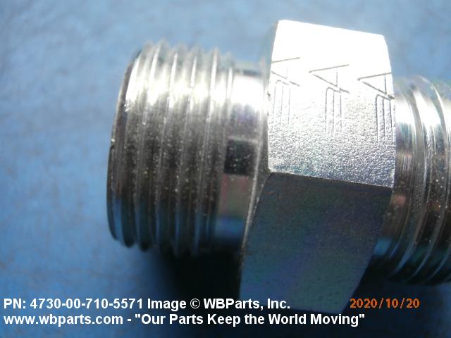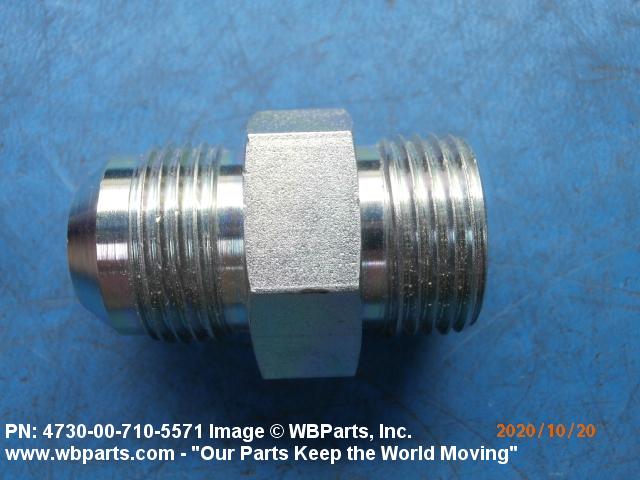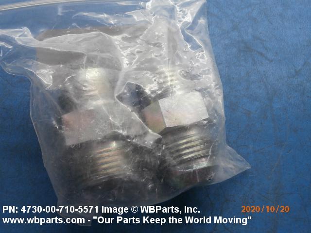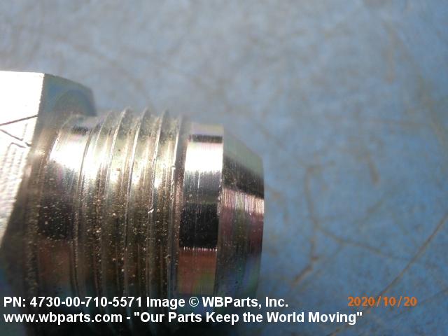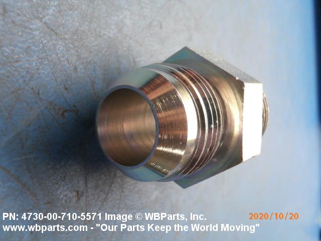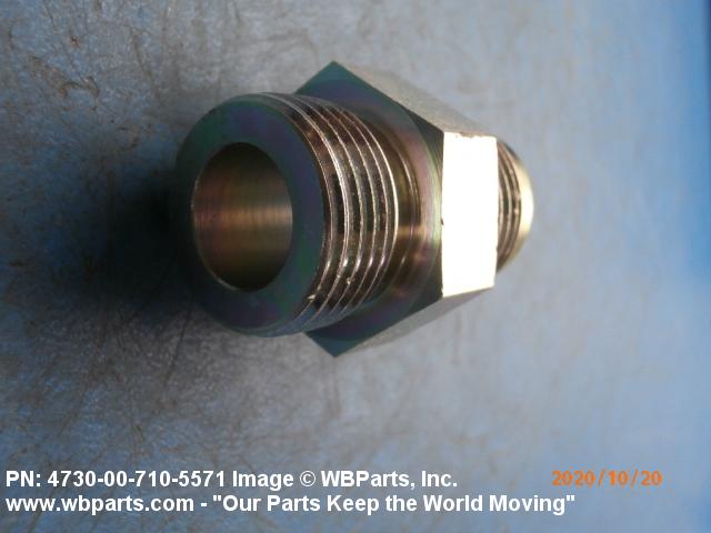 4730-00-710-5571 An adapter having machine threads (straight threads other than pipe or hose series) designed to accommodate a tube on one end or an unthreaded end designed to accommodate a tube. The other end has external or internal machine threads (straight threads other than pipe or hose series) and is designed to facilitate a gasket, preformed packing, washer, or the like to form a seal at the boss. It is designed to join a tube or tube fitting to a boss or boss fitting in a straight line on items such as tanks, housings, valve fittings, and the like. See also COUPLING, TUBE and NIPPLE, TUBE.