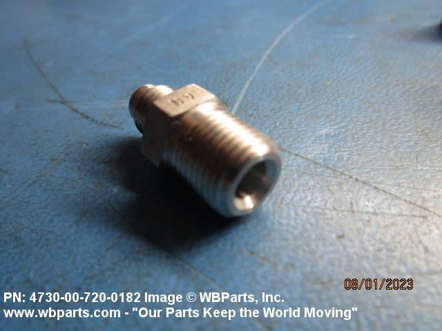 4730-00-720-0182 An adapter having standard pipe threads on one end or an unthreaded end designed to accommodate a pipe. The other end has external or internal machine threads (straight threads other than pipe or hose series) and is designed to facilitate a gasket, preformed packing, washer, or the like to form a seal at the boss. It is designed to join a pipe or pipe fitting to a boss or boss fitting in a straight line on items such as tanks, housing, valve fittings, or the like. See also ADAPTER BUSHING and COUPLING, PIPE.