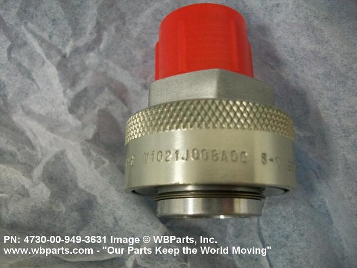 4730-00-949-3631 A fluid line fitting having a pipe, tube or hose connection or a through hole to accommodate a BOLT, FLUID PASSAGE on one end. The other end must have an internal or external quick disconnect feature for connecting a mating part to form a quick disconnect coupling assembly. The fitting may incorporate a self-sealing feature for the purpose of automatically shutting off the flow of fluid when disconnected from its mating half. For self-sealing fittings with an external or internal threaded disconnect end, see COUPLING HALF, SELF-SEALING. See also, CONNECTOR, MULTIPLE, FLUID PRESSURE LINE.
