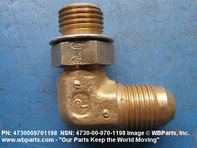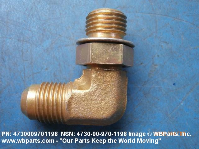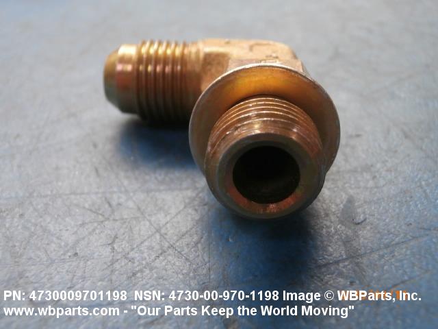 4730-00-970-1198 A fitting that forms an angle of less than 180 degrees (3.141 radians) from a straight flow. Both connecting ends have machine threads (straight threads other than pipe or hose series) designed to accommodate a tube or is unthreaded and designed to accommodate a tube. It may have side or heel inlet(s). See also ELBOW, PIPE and CONNECTOR, MULTIPLE, FLUID PRESSURE LINE.
