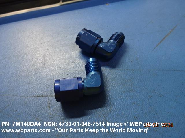 4730-01-046-7514 A fitting that forms an angle of less than 180 degrees (3.141 radians) from the straight flow. One connecting end has a swivel flange designed to permit axial rotation of the fitting, usually for the ease of installation, prior to securing it to a flange or mounting pad. The other end has machine threads (straight threads other than pipe or hose series) designed to accommodate a swivel flange. It may have side and/or heel inlets.