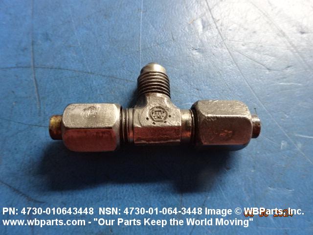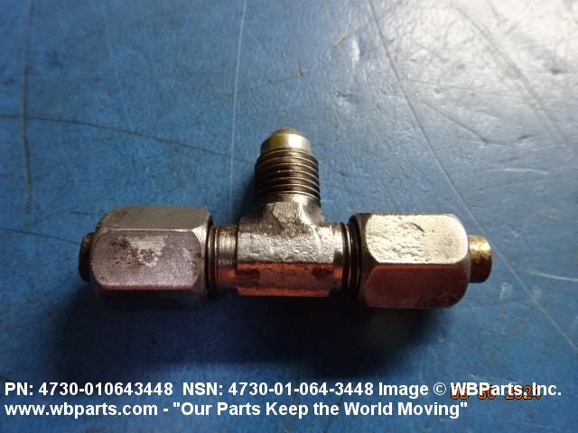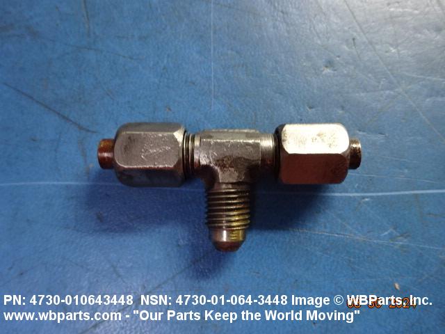 4730-01-064-3448 A fitting having three connections with the branch connection fixed at 90 degrees (1.5705 radians) to the run. The pipe connection(s) has standard pipe threads, or is unthreaded and designed to accommodate a pipe. The tube connection(s) has machine threads (straight threads other than pipe or hose series) designed to accommodate a tube, or is unthreaded and designed to accommodate a tube. It may have side inlet(s). It is used as a junction at the intersection of pipe or pipe fitting and a tube or tube fitting.