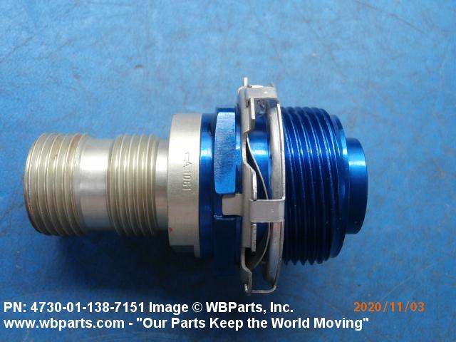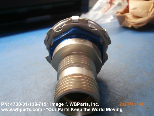 4730-01-138-7151 A fluid line fitting having a pipe, tube or hose connection or a through hole to accommodate a BOLT, FLUID PASSAGE on one end. The other end must have an external or internal thread for connecting a mating part to form a self-sealing coupling assembly. The fitting has either a self-sealing feature for the purpose of automatically shutting off the flow of fluid when disconnected from its mating half, or, if it has no self-sealing feature, is specifically designed to mate with a fitting with a self-sealing feature. For self-sealing fittings with a quick disconnect end, see COUPLING HALF, QUICK DISCONNECT. For fluid line fittings without a self-sealing feature, see COUPLING (as modified).