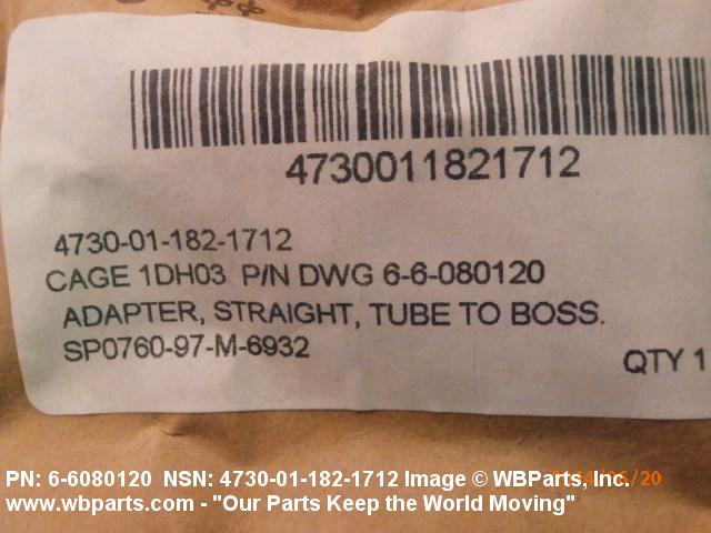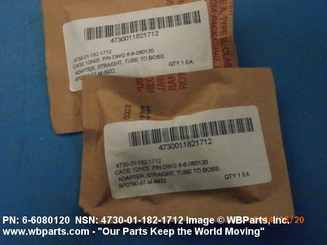 4730-01-182-1712 An adapter having machine threads (straight threads other than pipe or hose series) designed to accommodate a tube on one end or an unthreaded end designed to accommodate a tube. The other end has external or internal machine threads (straight threads other than pipe or hose series) and is designed to facilitate a gasket, preformed packing, washer, or the like to form a seal at the boss. It is designed to join a tube or tube fitting to a boss or boss fitting in a straight line on items such as tanks, housings, valve fittings, and the like. See also COUPLING, TUBE and NIPPLE, TUBE.