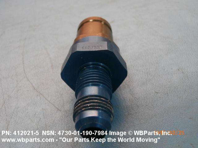 4730-01-190-7984 A fluid line fitting having a pipe, tube or hose connection or a through hole to accommodate a BOLT, FLUID PASSAGE on one end. The other end must have an internal or external quick disconnect feature for connecting a mating part to form a quick disconnect coupling assembly. The fitting may incorporate a self-sealing feature for the purpose of automatically shutting off the flow of fluid when disconnected from its mating half. For self-sealing fittings with an external or internal threaded disconnect end, see COUPLING HALF, SELF-SEALING. See also, CONNECTOR, MULTIPLE, FLUID PRESSURE LINE.