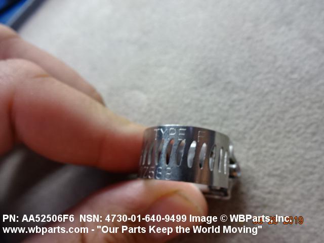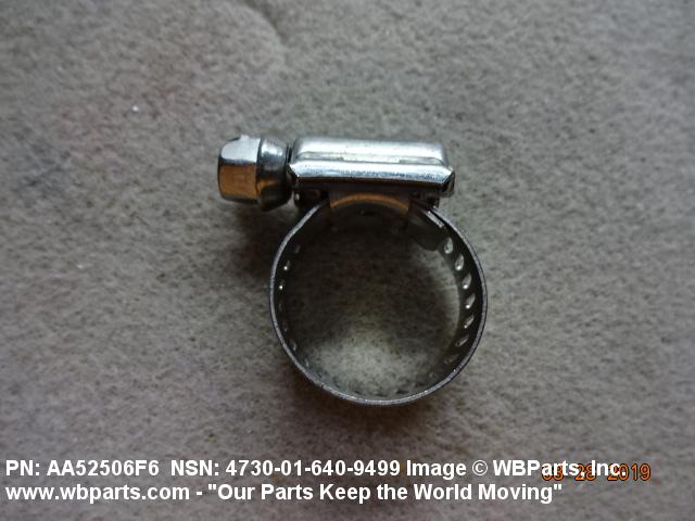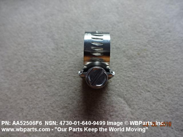 4730-01-640-9499 A clamp in which the body (band or wire) completely encircles an item and distributes a relatively even amount of pressure throughout the entire 360 degrees (6.282 radians) of the periphery of the item to be compressed. Its compression quality is dependent upon an integral screw mechanism, (screw, bolt spring compression and the like mechanical fasteners), or it may be applied by a device not integral with the clamp itself. It is specifically designed to prevent leakage between a hose and its attaching connection(s) when the body of the clamp is round or circular. For square, rectangular, or irregularly shaped items, see CLAMP, HOSE, SPECIAL-SHAPED. Excludes CLAMP, ELECTRICAL; CLAMP, LOOP; CLAMP, FIRE HOSE, SHUTOFF; FERRULE (as modified); and HAND SCREW.