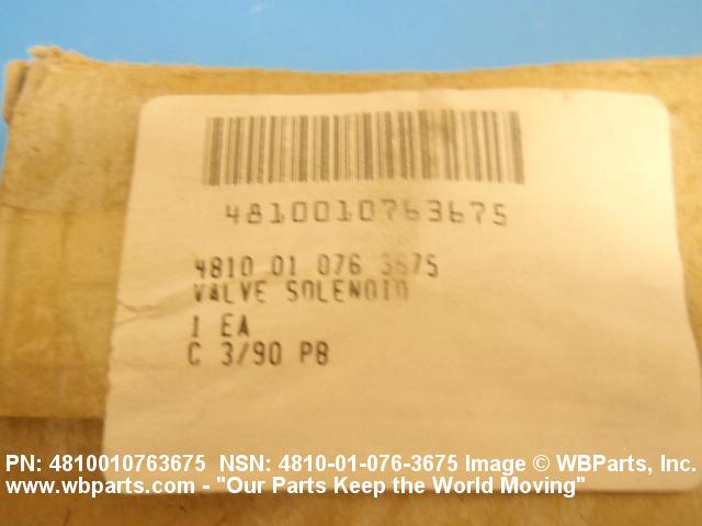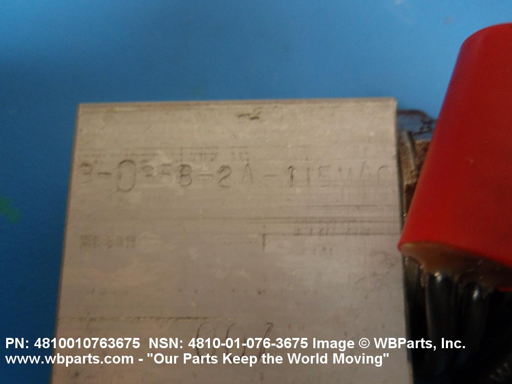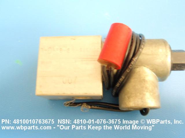 4810-01-076-3675 A valve having two or more ports with valve stem or pilot needle in a normally open or closed position. It is specifically designed to stop or start or change the flow of fluid by means of the magnetic action of an electric coil on a moveable core or plunger. The valve may be equipped with a manual opening or closing device. For items with three or more ports that utilize a reciprocating slide with recess areas which mate with ports in an integral or replaceable ported sleeve, see VALVE (1), LINEAR, DIRECTIONAL CONTROL. It may be inline or cartridge (manifold) design. Excludes VALVE (1), BUTTERFLY.