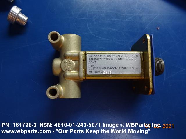 4810-01-243-5071 A valve having two or more ports with valve stem or pilot needle in a normally open or closed position. It is specifically designed to stop or start or change the flow of fluid by means of the magnetic action of an electric coil on a moveable core or plunger. The valve may be equipped with a manual opening or closing device. For items with three or more ports that utilize a reciprocating slide with recess areas which mate with ports in an integral or replaceable ported sleeve, see VALVE (1), LINEAR, DIRECTIONAL CONTROL. It may be inline or cartridge (manifold) design. Excludes VALVE (1), BUTTERFLY.