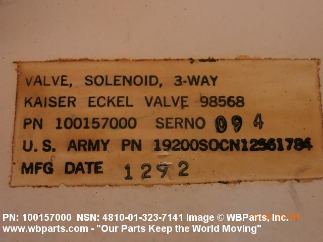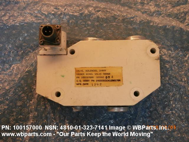 4810-01-323-7141 A valve having two or more ports with valve stem or pilot needle in a normally open or closed position. It is specifically designed to stop or start or change the flow of fluid by means of the magnetic action of an electric coil on a moveable core or plunger. The valve may be equipped with a manual opening or closing device. For items with three or more ports that utilize a reciprocating slide with recess areas which mate with ports in an integral or replaceable ported sleeve, see VALVE (1), LINEAR, DIRECTIONAL CONTROL. It may be inline or cartridge (manifold) design. Excludes VALVE (1), BUTTERFLY.