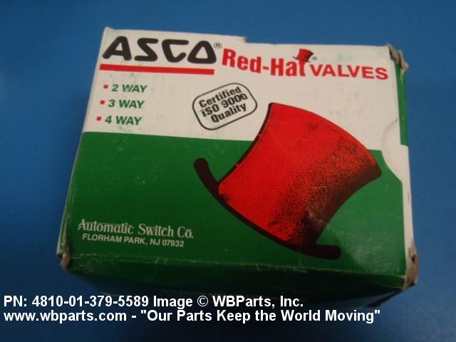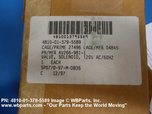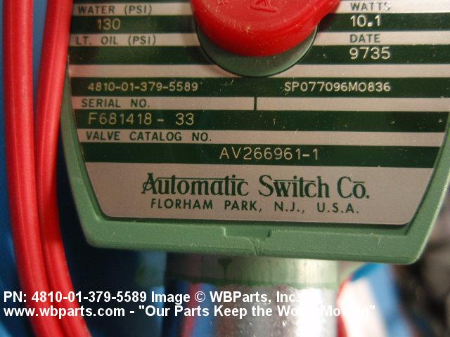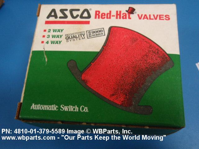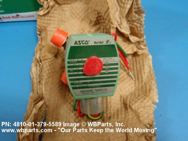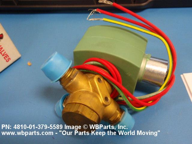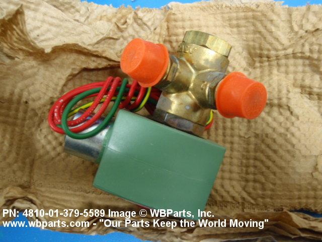 4810-01-379-5589 A valve having two or more ports with valve stem or pilot needle in a normally open or closed position. It is specifically designed to stop or start or change the flow of fluid by means of the magnetic action of an electric coil on a moveable core or plunger. The valve may be equipped with a manual opening or closing device. For items with three or more ports that utilize a reciprocating slide with recess areas which mate with ports in an integral or replaceable ported sleeve, see VALVE (1), LINEAR, DIRECTIONAL CONTROL. It may be inline or cartridge (manifold) design. Excludes VALVE (1), BUTTERFLY.