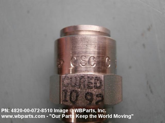 4820-00-072-8510 A valve designed to automatically release excessive pressures. It is actuated by static pressure upstream of the valve and is used as a safety valve or relief valve, and may be set to close at a predetermined pressure. It is not designed for regulation of continuously fluctuating loads. It may be inline or cartridge (manifold) design. Excludes VALVE (1), RELIEF, PRESSURE AND TEMPERATURE.