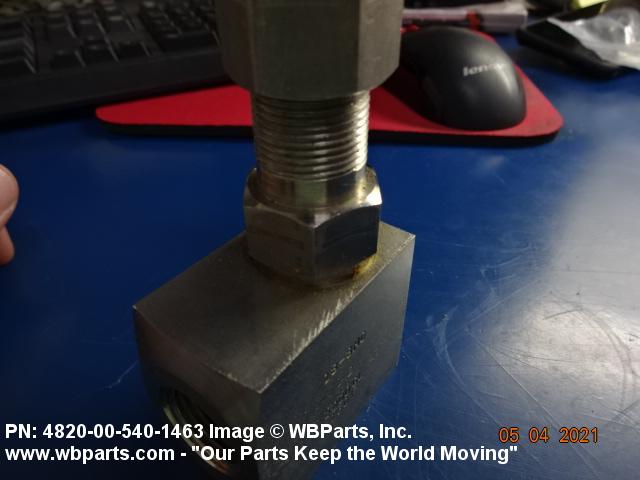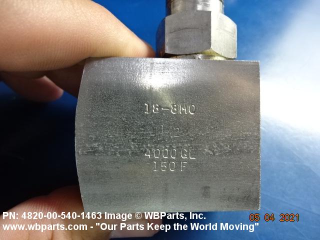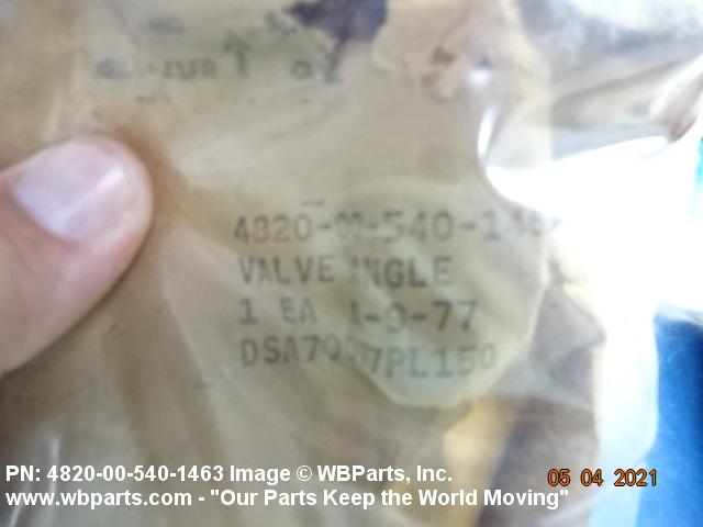 4820-00-540-1463 A valve with one inlet and one outlet connection with outlet flow at an angle to inlet flow. The flow is controlled by the action of a stem which lifts disks perpendicularly off the center axis of its seat. It may be inline or cartridge (manifold) design. Excludes VALVE (1), Y; VALVE, STOP-CHECK; and COCK, SHUTOFF, SCREW STEM.20248100015Valves, Powered48200018Valves, Nonpowered