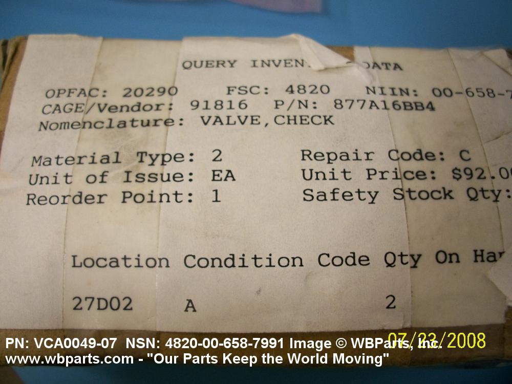 NSN 4820-00-658-7991 VCA004907, VCA0049-07, 1111587350