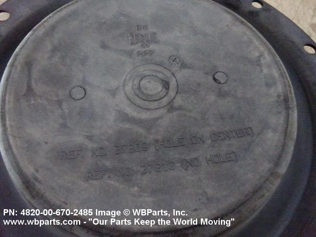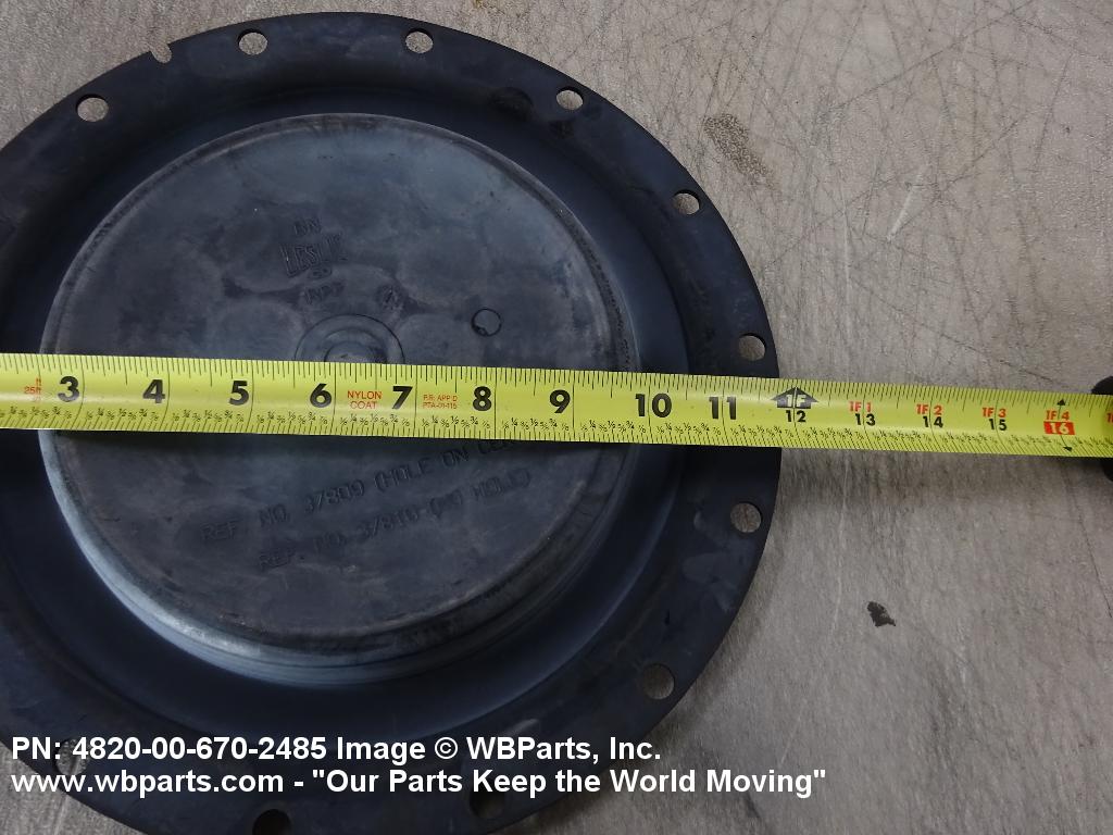 4820-00-670-2485 An item constructed of one or more layers of thin flexible material, either laminated or separated, designed to form a tight seal between the chambers of a valve, and to transmit pressure inducted motion to a valve disk either directly or through a mechanical linkage. The surface of the item must be formed or molded to have a beaded or rolled edge, ribs or any other raised surfaces. The item may contain bolt holes and/or center holes. Excludes DIAPHRA GM, VALVE, FLAT and GASKET.20529100042Engine Fuel System Components, Nonaircraft29150064Engine Fuel System Components, Aircraft and Missile Prime Movers42200038Marine Lifesaving and Diving Equipment48100015Valves, Powered48200018Valves, Nonpowered