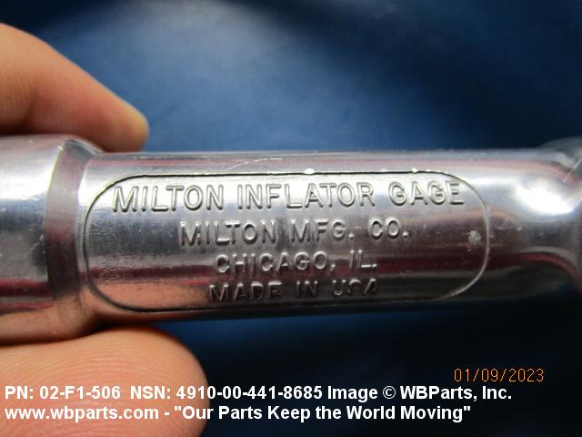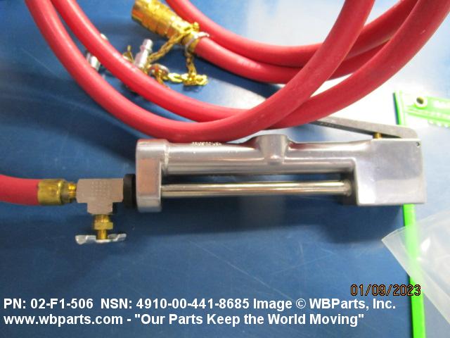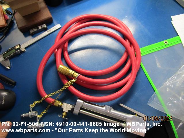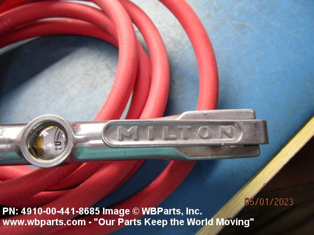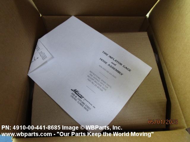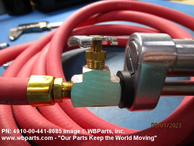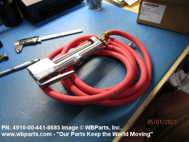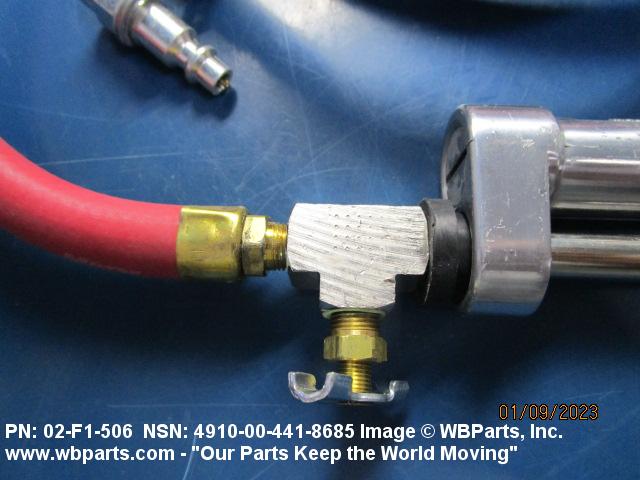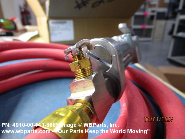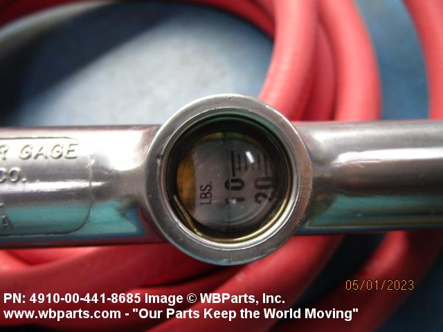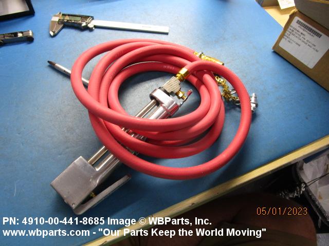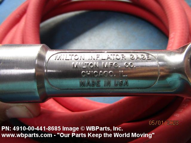 4910-00-441-8685 An item consisting essentially of a pneumatic tire pressure gage with an attached length of hose equipped with device for supplying compressed air to a tire valve stem. In service the item is connected to an air supply hose.