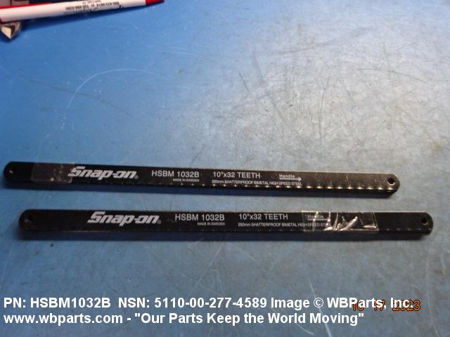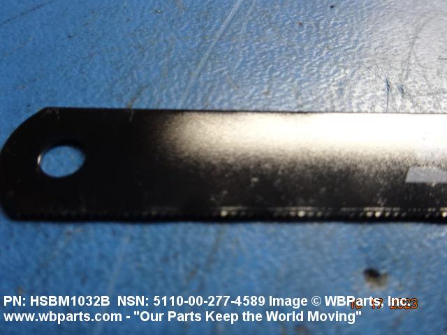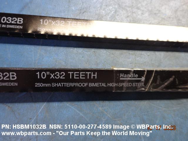 5110-00-277-4589 A narrow rectangular strip of steel 0.025 inch (0.63 mm) or less in thickness, with cutting teeth along one or both edges, (usually 6 to 14 inches (152.4 mm to 355.6 mm) long with 14 to 32 cutting teeth per inch) hardened and tempered for cutting various types of metals. The ends of the item are designed for attachment to a FRAME, HAND HACKSAW.
