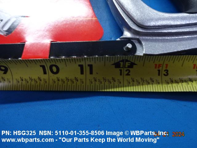 5110-01-355-8506 A metal cutting handsaw with a closed grip handle fastened at the wide end of a straight back blade. The unset cutting teeth on the blade are designed for cutting metal and are milled straight across.