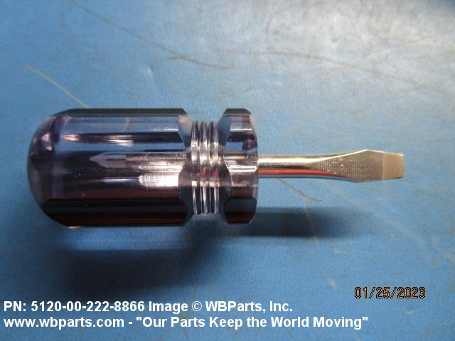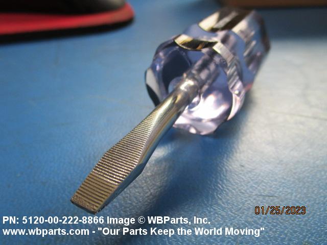 5120-00-222-8866 A manual screwdriver having a single, nonremovable, flat tip blade. The blade has a flared or straight sided tip. For items having more than one blade, see SCREWDRIVER BIT SET AND HANDLE. Excludes SCREWDRIVER, JEWELER'S SWIVEL KNOB; SCREWDRIVER, RATCHET; and SCREWDRIVER, SPARK TESTING.