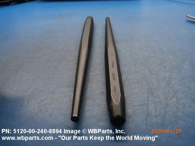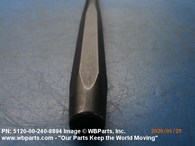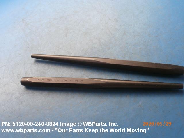5120-00-240-8894 A round, square, hexagonal or octagonal bodied hand tool, having a round tapered section 6-1/2 inches (165.1 mm) or more in length, which terminates in a flat blunt face. See also PUNCH, DRIVE PIN; PUNCH, DRIFT and DRIFTPIN.