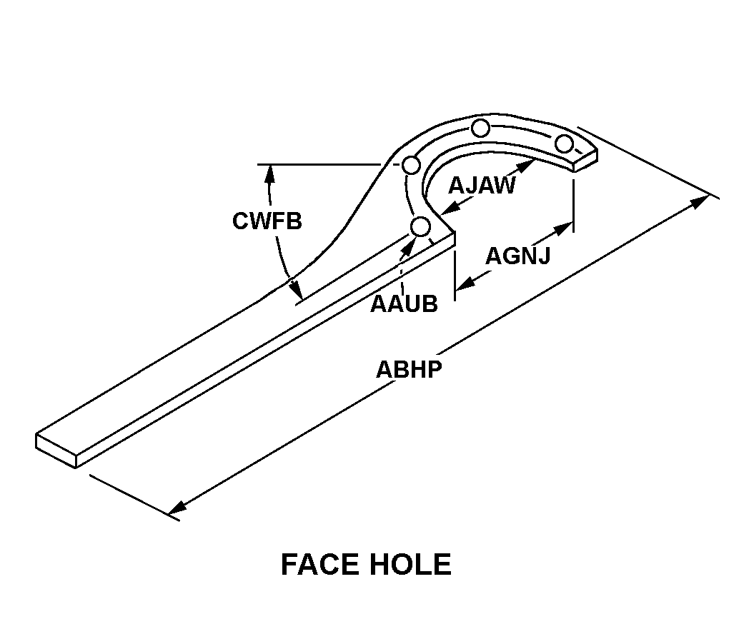 5120-00-601-0913 A tool on which are located one or more pins, lugs, holes, keyways, or hooks, designed to engage matching holes, slots, or projections on a coupling, nut, or the like; for exerting a torsional force, concentrated at a point or points of a mating part, tending to turn the mating part about an axis. The drive end may have a hole for a separate straight bar used as a handle. Excludes WRENCH, BUNG.