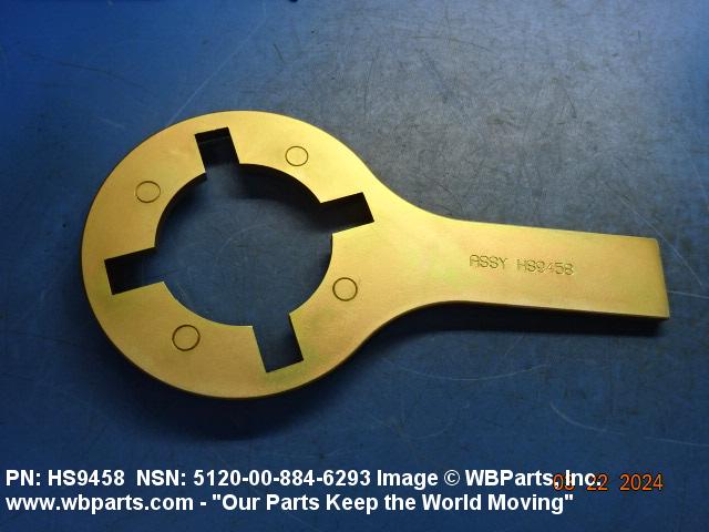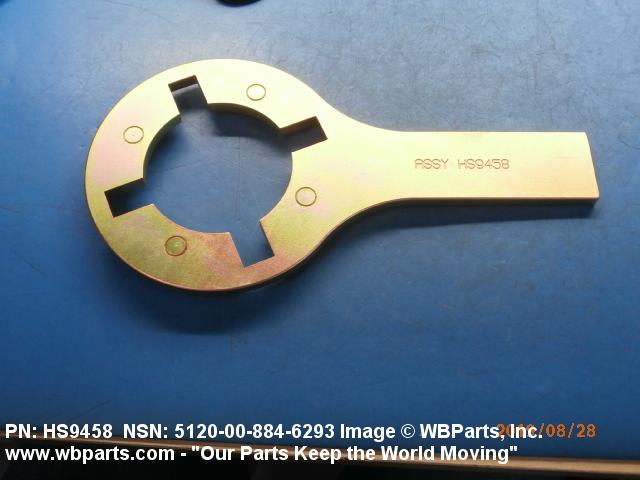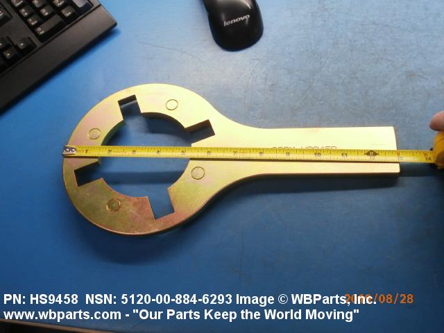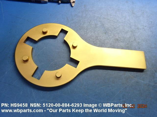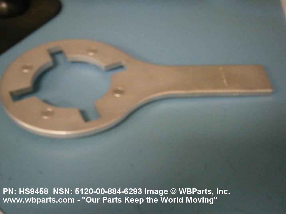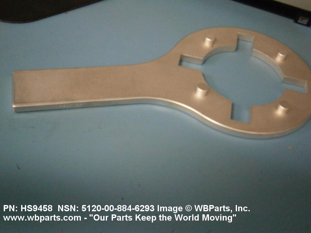 5120-00-884-6293 A tool on which are located one or more pins, lugs, holes, keyways, or hooks, designed to engage matching holes, slots, or projections on a coupling, nut, or the like; for exerting a torsional force, concentrated at a point or points of a mating part, tending to turn the mating part about an axis. The drive end may have a hole for a separate straight bar used as a handle. Excludes WRENCH, BUNG.