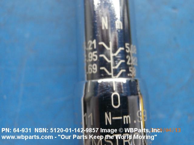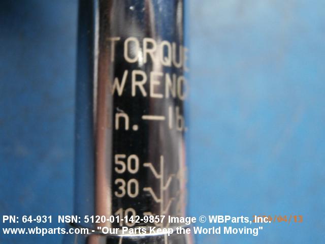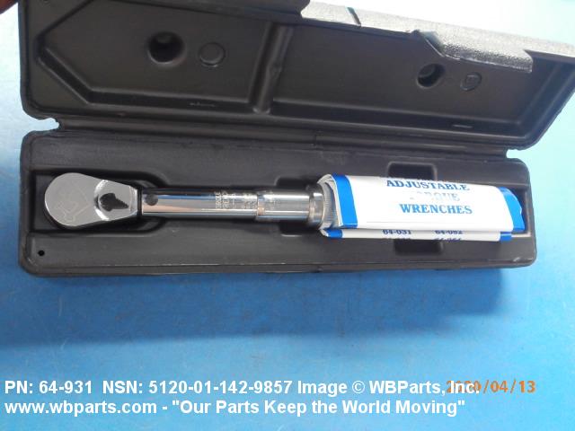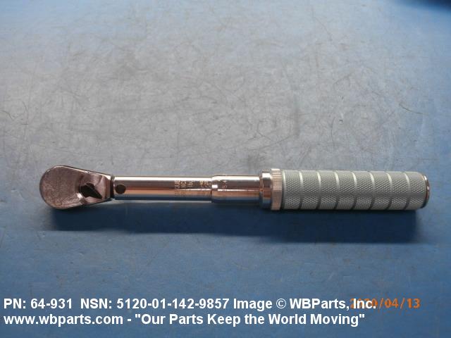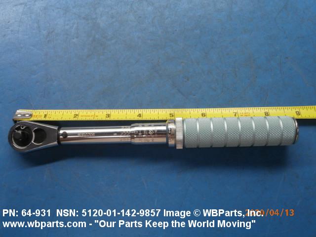 5120-01-142-9857 A manual tool for tightening various fasteners to a precise torque value. Consists of a handle and drive to accommodate female square drive sockets and other types of wrenching adapters. Torque value may be manually set and adjusted by user or may be provided as preset for production line use. A signaling device is generally provided to indicate when set torque value is reached. Handle is swung at right angle to axis of fastener rotation to apply torque. For items with handles that are spun in-line with axis of fastener rotation to apply torque, see SCREWDRIVER, TORQUE.2025120000065200043Dental Instruments, Equipment, and Supplies